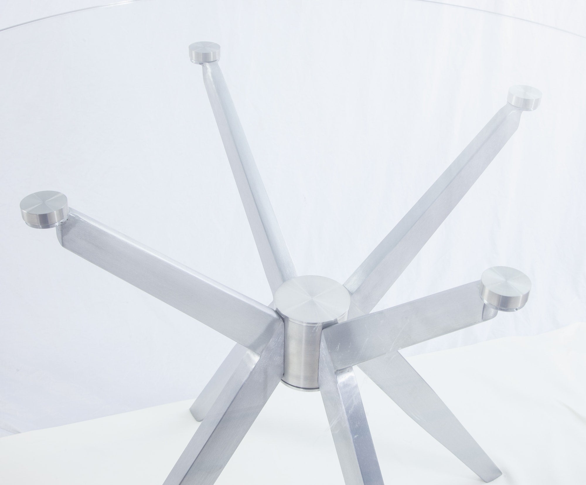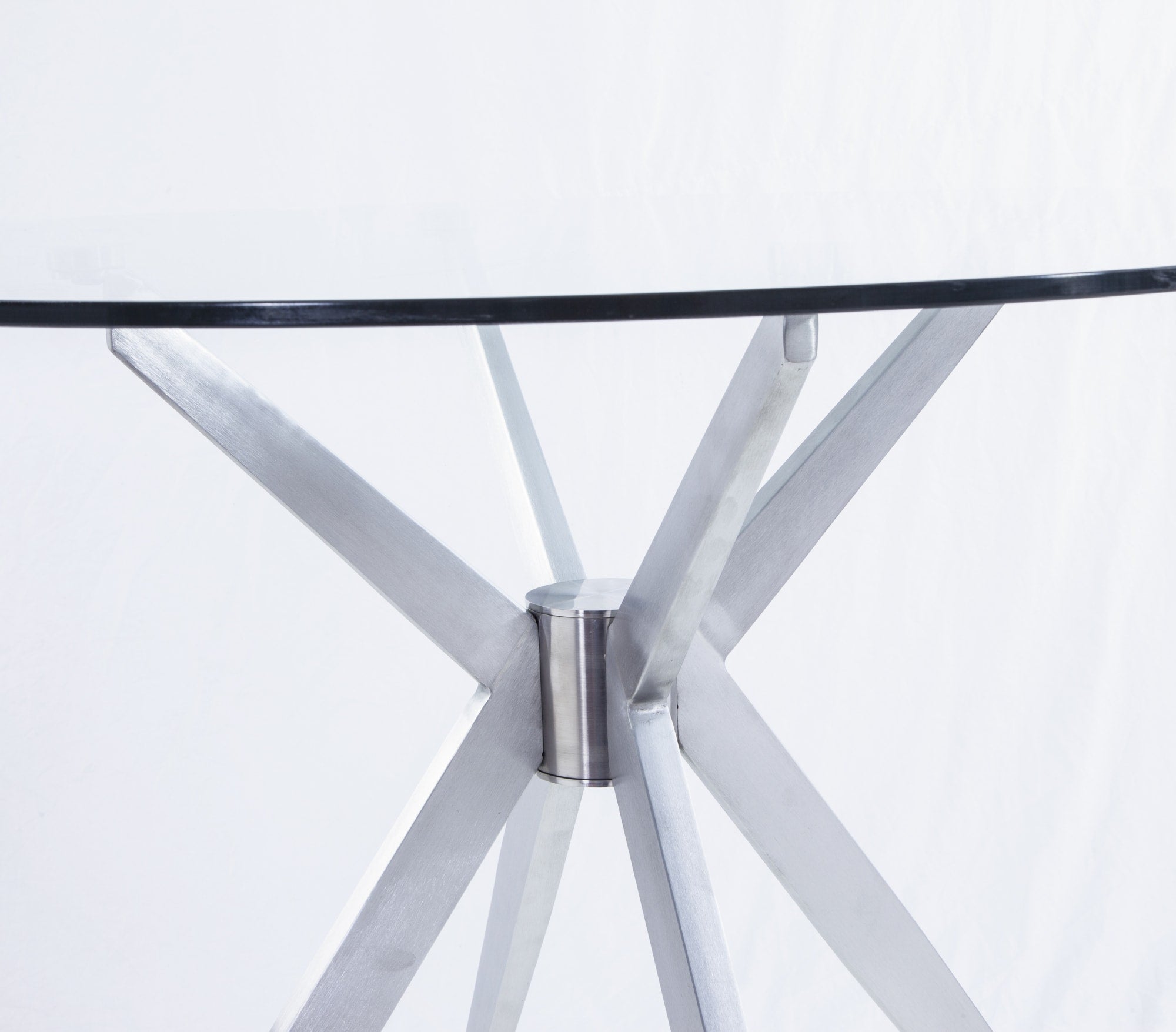 The Dallas Dining table features a 12mm clear glass top, centered over a crisscrossed brushed stainless steel base, that is held together by a brushed stainless steel cylinder at the legs intersecting point. The table is versatile in style, and can fit in with many interiors that are contemporary, modern, mid-century and industrial, and can seat upto 4.