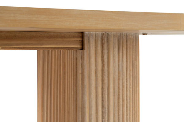 The Modrest Jacobson - Modern Natural Acacia Oval Dining Table showcases a captivating blend of contemporary style and natural warmth. Its sleek oval shape is complemented by a smooth wood surface, beautifully highlighting the rich grain of acacia. The unique, fluted pedestal bases add a touch of artistry, enhancing its modern appeal. This table serves as a striking centerpiece for any dining area, creating an inviting atmosphere for gatherings. Additionally, it comfortably accommodates up to 6 people, making it perfect for family dinners or entertaining guests.