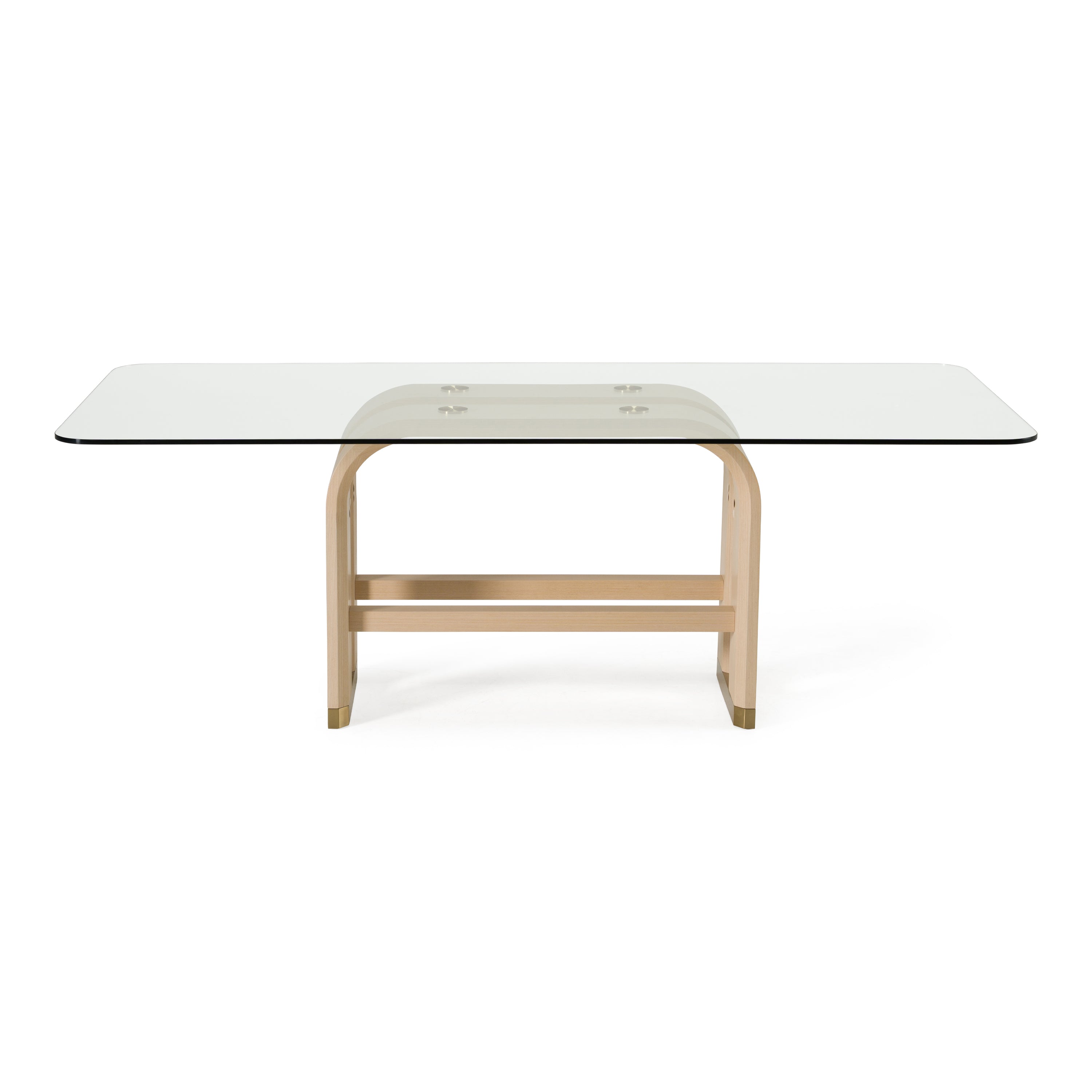 A masterpiece of modern elegance, the Florence dining table gracefully unites minimalist design with opulent materials. The clarity of its tempered glass top offers a window into the soul of sophistication, resting upon a foundation of natural oak that exudes warmth and authenticity. Brushed gold stainless steel accents elevate the structure to an artful stature, while the trestle base evokes both strength and subtlety. Ideal for intimate gatherings or grand feasts, it invites conversation amidst an aura of timeless luxury.