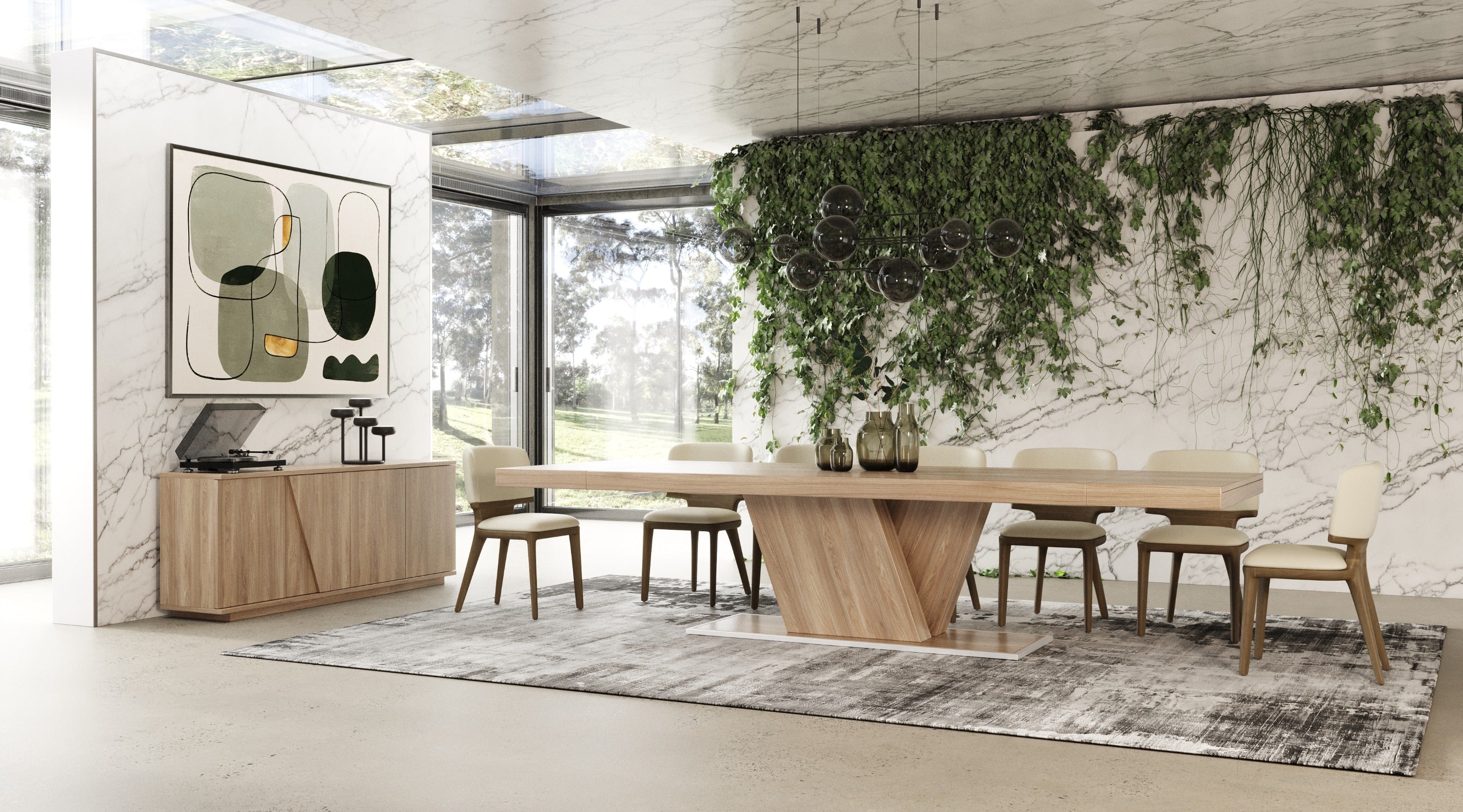 The Nova Domus Victoria Extendable Dining Table is rivaled by no other. The Walnut Caracalla matte finish adorns the extra long table top and adds texture to your dining space. When extended, this fantastic top fits up to 14 at full extension. The diagonal base pieces create a structural piece of art that is sure to wow.