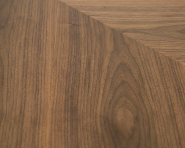 Cora is a Modern Square Dining Table with Pedestal Base in Walnut and Black Tempered Glass. Perfect for dining conversations and smaller dining rooms.