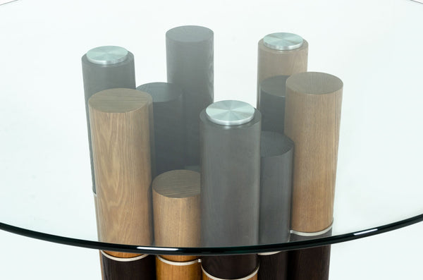 The Greta Table is a stylish modern marvel. Cylindrical tubes make up a staggered base with a mix of deep acacia and light walnut finishing. Stainless steel accents and a glass top finish the astonishing textures of this mesmerizing table. The modern lines and contemporary textures blend perfectly to make a solid table with style and substance.