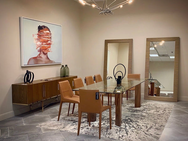 This lovely dining table is perfect for grand dining. When extended, the Helena Dining Table easily fits 10 people. When condensed, it can fit up to 8. The clear glass top shows off the internal machinations of the table, finihsed in a stainless steel. This makes the table fit perfectly in an industrial or rustic setting. The solid wood legs, finished in a walnut veneer, ground the table to an earthy element. Perefect for a mid-century or modern room.
