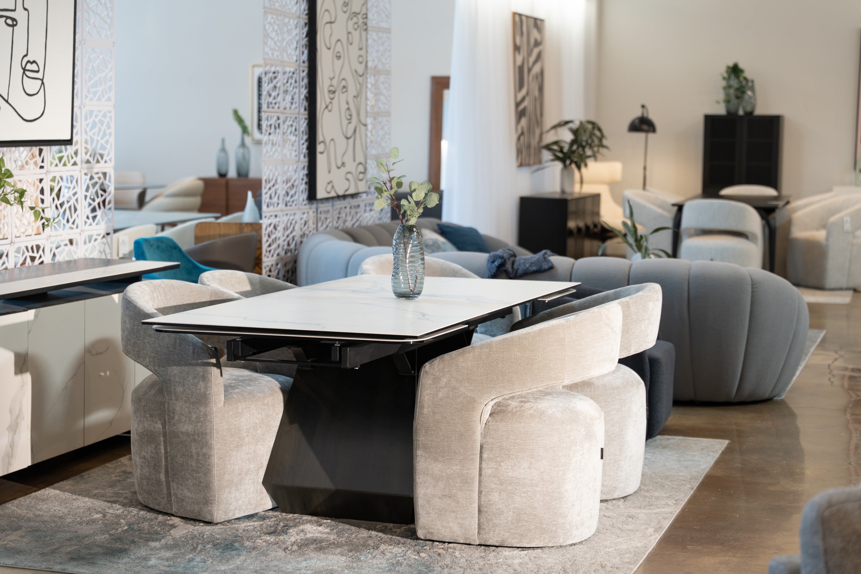 The Howell Dining Table is the perfect modern piece for your home. The Vessel shaped base is finished in a brown iron metal which perfectly contrasts the soft white ceramic top. Two extendable leaves add extra functionality to this stylish piece and offer seating for up to eight. Have the look of the grand marble table you want with an easier to clean ceramic that will hold the test of time.