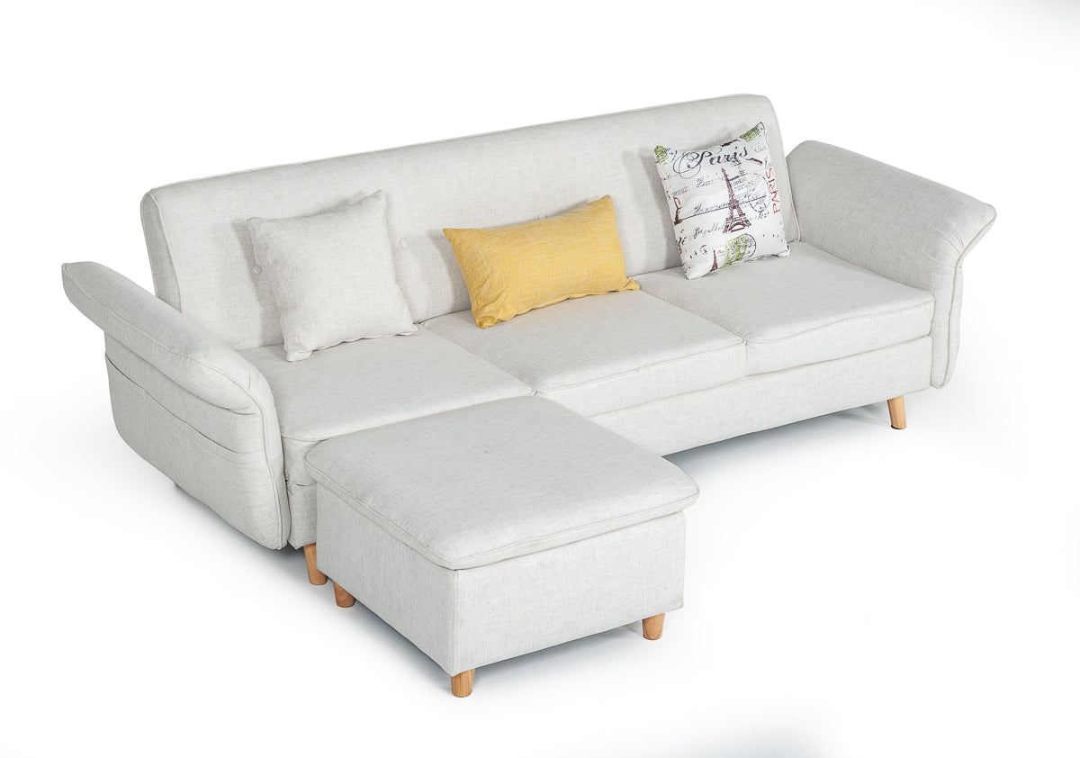 Perfect for small spaces, the Divani Casa Jeremiah Modern Ivory Fabric Sofa bed and Ottoman oozes with style. Framed in wood and upholstered in dainty ivory fabric, this item is a perfect balance of classic and glam look. A great space saver, this sofa bed easily folds up into a bed, giving you access anytime you want to use it for that purpose. Designed with arms that flare outwards, it comes with delicately stitched side pockets on the outer side of the arms, where you can insert magazines. Tufted buttons adorn the outer side of the arms. The dual-purpose ottoman opens up to reveal a storage compartment. Stubby tapered wood legs provide stable support.