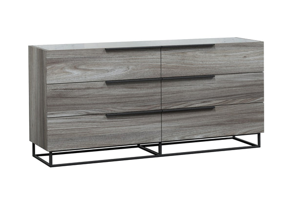 Give your bedroom that much-needed oomph and keep clutter at bay with the Nova Domus Enzo Italian Modern Grey Oak Dresser. Constructed with a sleek matte grey Walnut Veneer finish, it has 6 equal-size soft-closing drawers with black metal pulls. All drawers are spacious and has a Walnut Veneer inside. Designed with a striking black glass top, it offers ample space for a vase of flowers, a potted plant, sculpture, photos, and frames. Place your makeup accessories or perfume on a silver decorative place and put it on the dresser glass top, then hang a mirror above it, and you have a scene-stealer vanity in your bedroom.