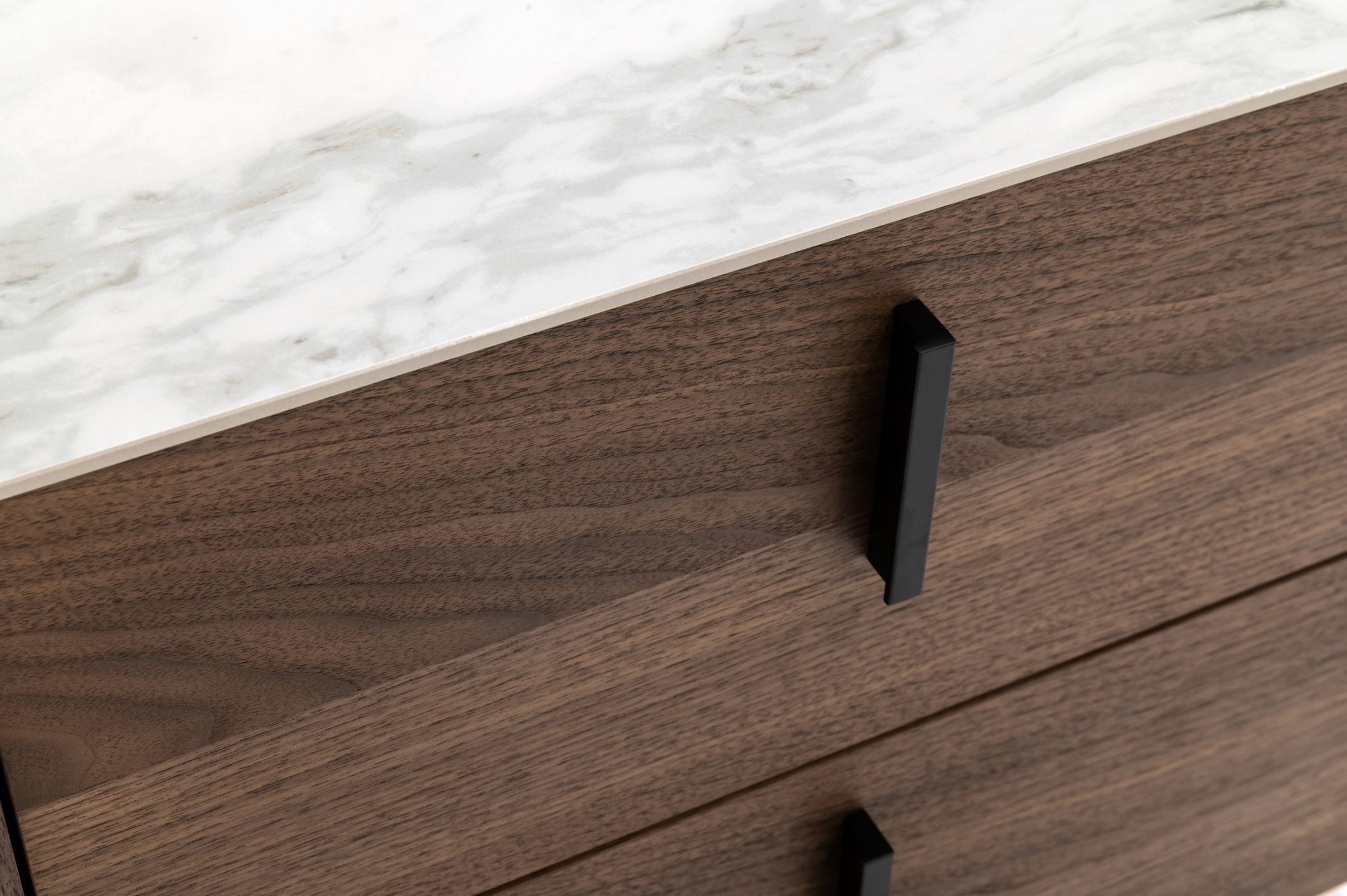 The Modrest Chelton Buffet is a gorgeous example of Mid-Century design. The curved walnut veneer legs extend all the way to the top of the buffet. A white ceramic top with curved edges finishes the top of the piece. Three walnut veneer faced drawers have black vertical handles and can handle all your dining needs.