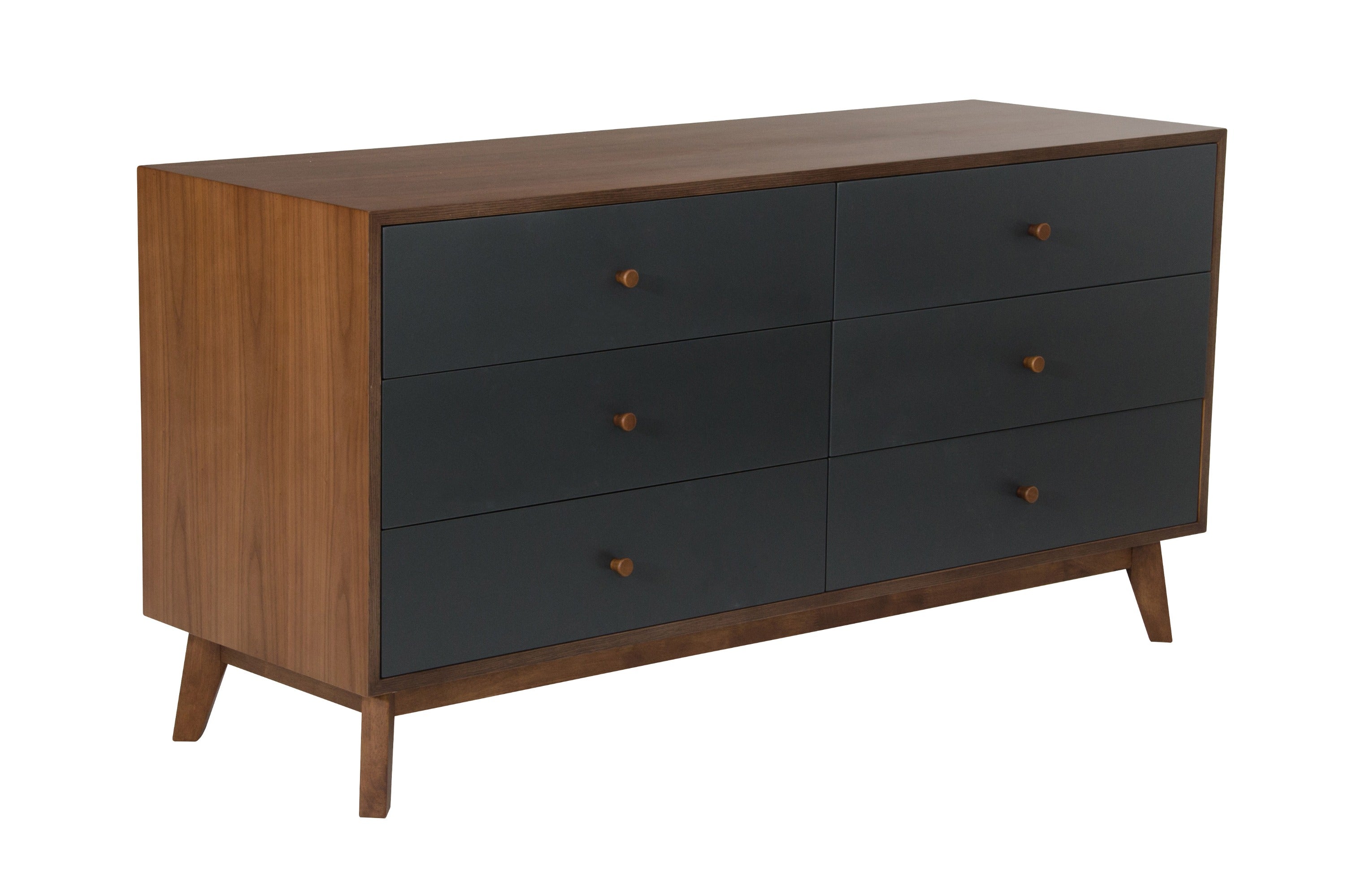 Built with simple lines and mid-century styling, the Nova Domus Dali Mid-Century Grey & Walnut Dresser is a functional and practical 6-drawer dresser with charcoal grey fronts and button-shaped pulls. The full-sized drawers gives you sufficient storage for your clothes and accessories. The Walnut Veneer finished body blends well in any wall paint color.
