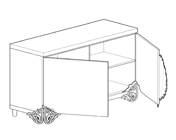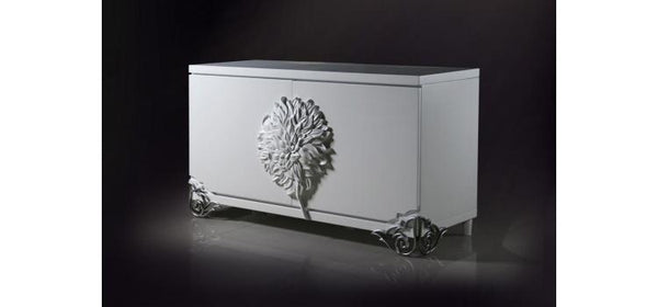 The Emma white lacquer modern buffet features a floral motif at the center, giving it a touch of nature. It is fitted with elegant intricately-designed zinc alloy legs in front that was augmented by a few more legs at the back and along the frame. This lacquer modern buffet is available in varying high gloss lacquer colors.
