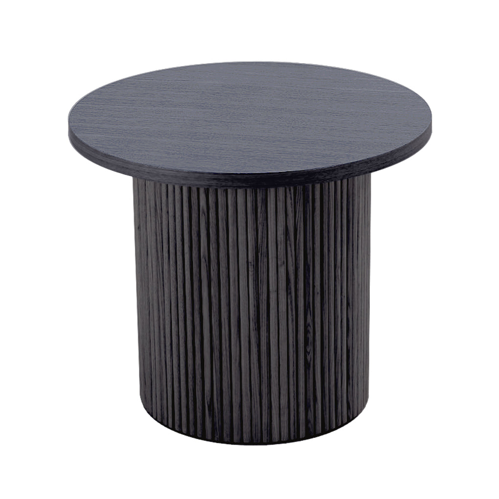 The Rawlins line is a head turner, with its stunning combination of black ash finish and tambour pedestal with vertical reeding. Set the stage next to the matching coffee table or a mid century modern sofa for the perfect resting area for your crafted cocktail or tablet.