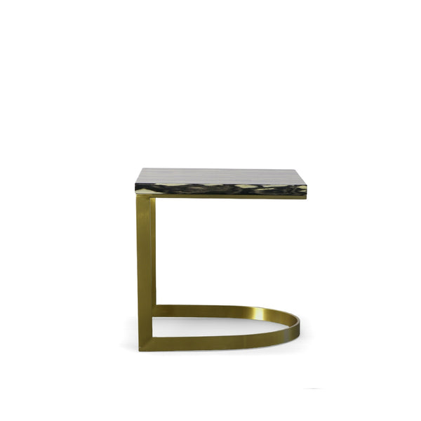 This glam end table features a rectangular black and white faux-marble top. There is a brushed gold stainless steel asymmetrical base, which adds to the unique style of this piece.