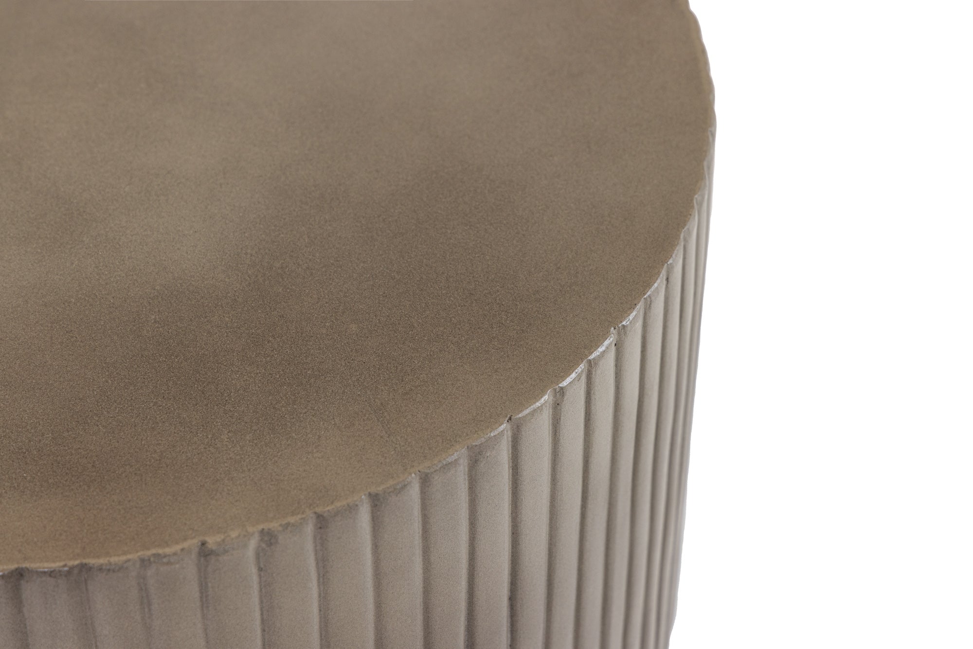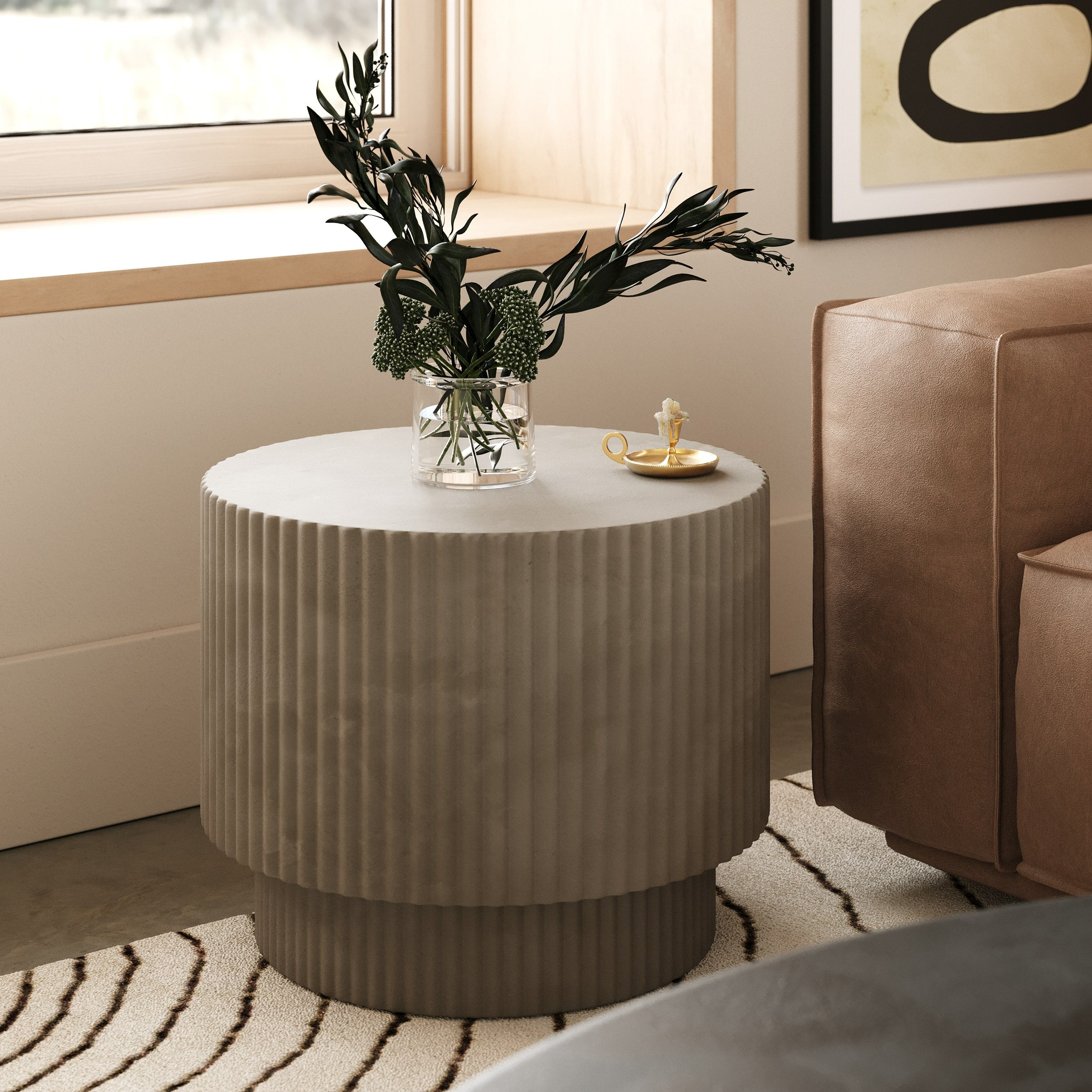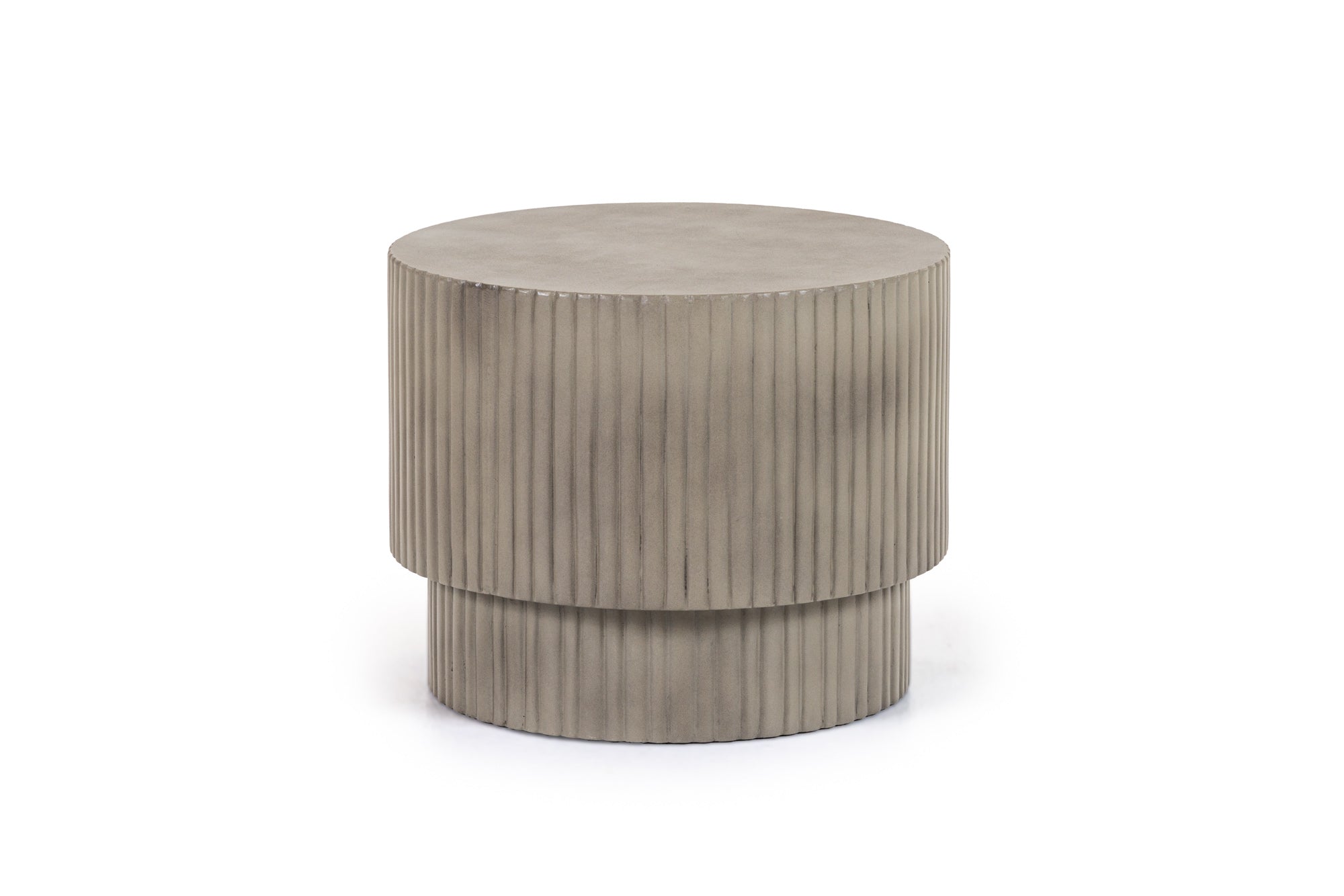 The Modrest Gruver Modern Grey Concrete End Table showcases a striking, cylindrical design characterized by its ribbed texture. Crafted from sleek grey concrete, it emanates an industrial yet contemporary aesthetic, making it an excellent addition to various interior styles. Its unique form and understated elegance enhance any living space, serving as both a functional surface and an eye-catching piece of art. This versatile end table seamlessly complements sofas or chairs, offering style and practicality for modern living.
