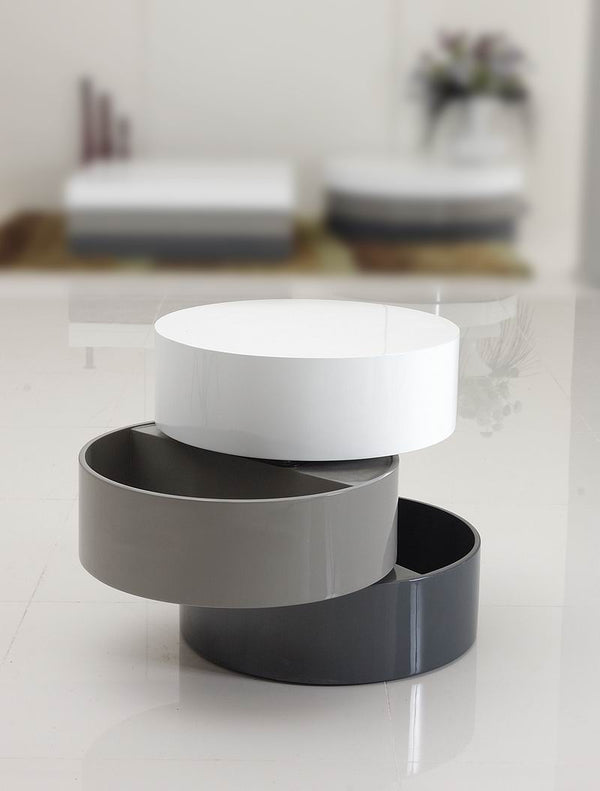 The Trio 1 modern 3-tone round end table has a 3-tiered smart design. When swiveled, it reveals 2 levels of storage compartments, exhibiting utmost functionality and allows you to recreate it appearance without assembling it. Available in larger sizes and in square shape, this round end table can also be used as a nightstand.