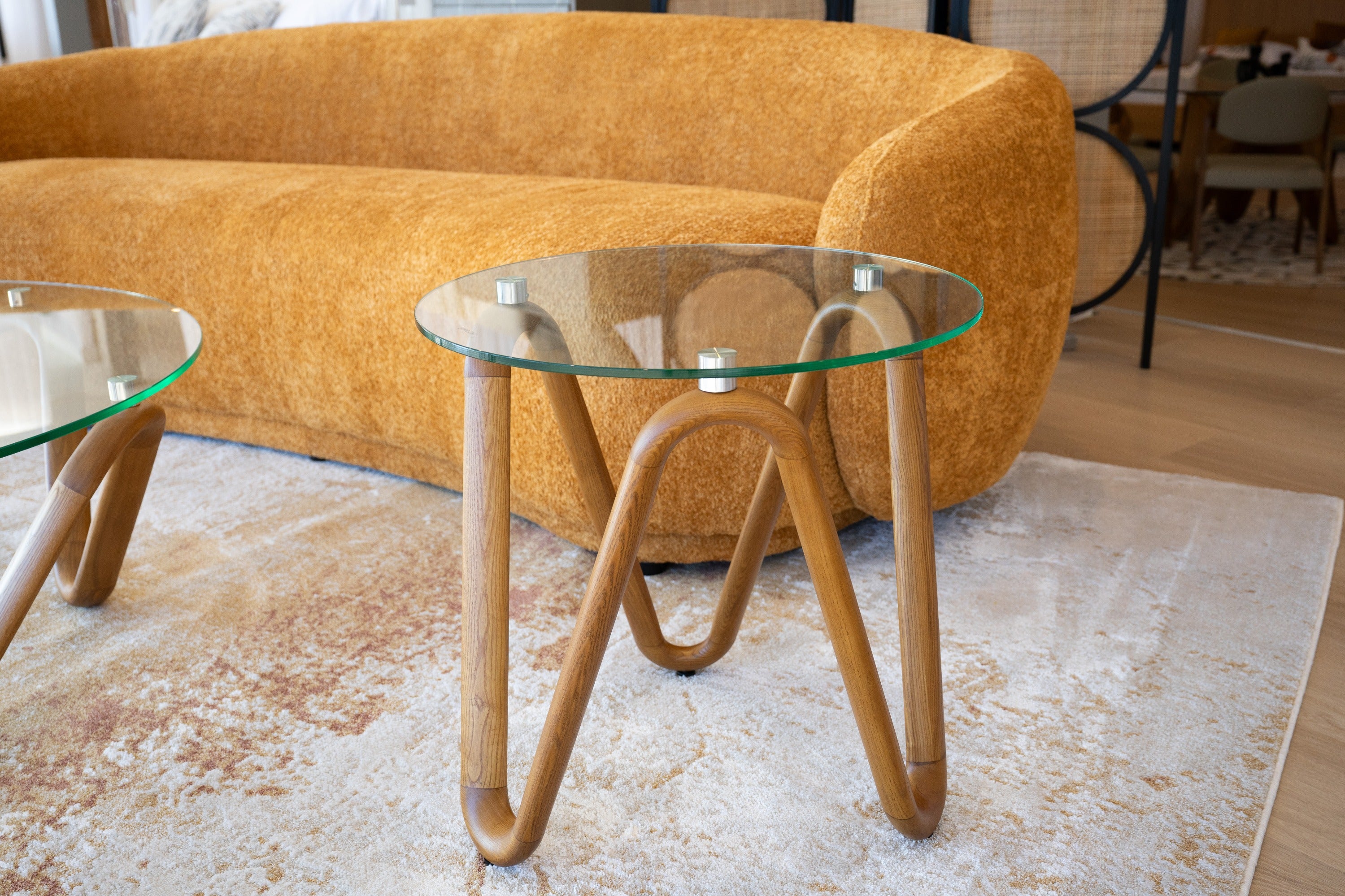The wooden base creates a sinuous serpentine path just under the surface of this gleaming coffee table. The Lassen End Table is a perfect accent piece for your mid-century modern space. A 10 mm tempered glass top is perfectly attached to this wave like base to create an extreme style with tons of potential. Pair with a hide rug and woven side chair for a perfect pairing.