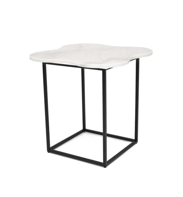 The amoebas white stone top of the Aleidy End Table rests upon a stylish black metal frame. This square tube frame is sturdy and stylish. the hard finish of the frame against the soft stone creates a beautiful juxtaposition of contemporary and industrial styles.
