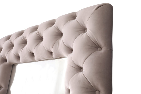 The Legend Floor Mirror is a stylish traditional style piece with a grand upholstery in grey velvet. Diamond button tufting and soft fabric make this a must-have for any glam home.
