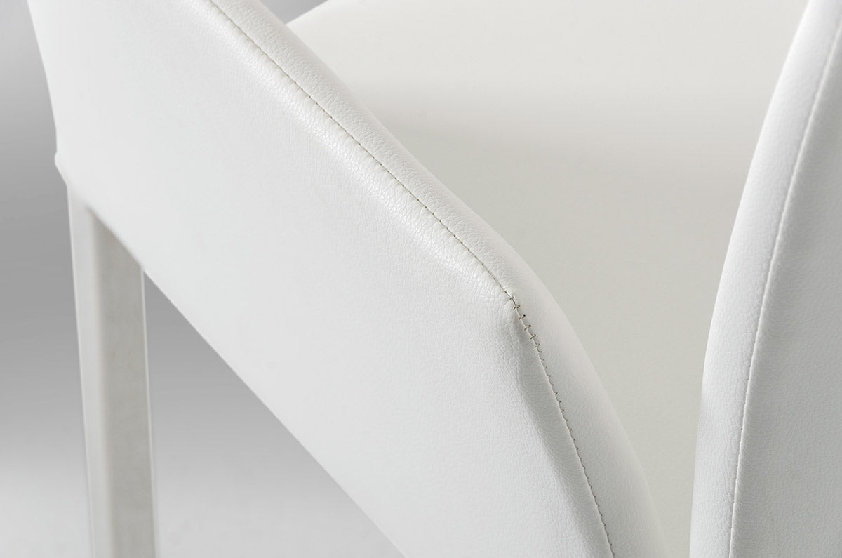 The Modrest Avril Modern White Leatherette Dining Chair features a unique design with a slightly curved parted armrests and backrest. This white leatherette upholstered dining chair measures W19" x D20" x H33" and stands on sturdy willowy stainless steel legs.