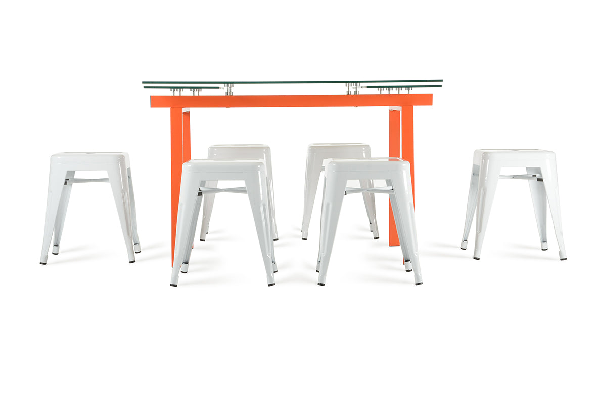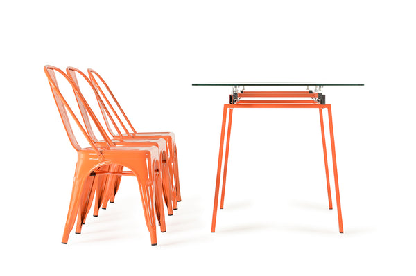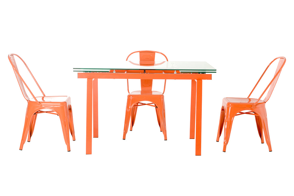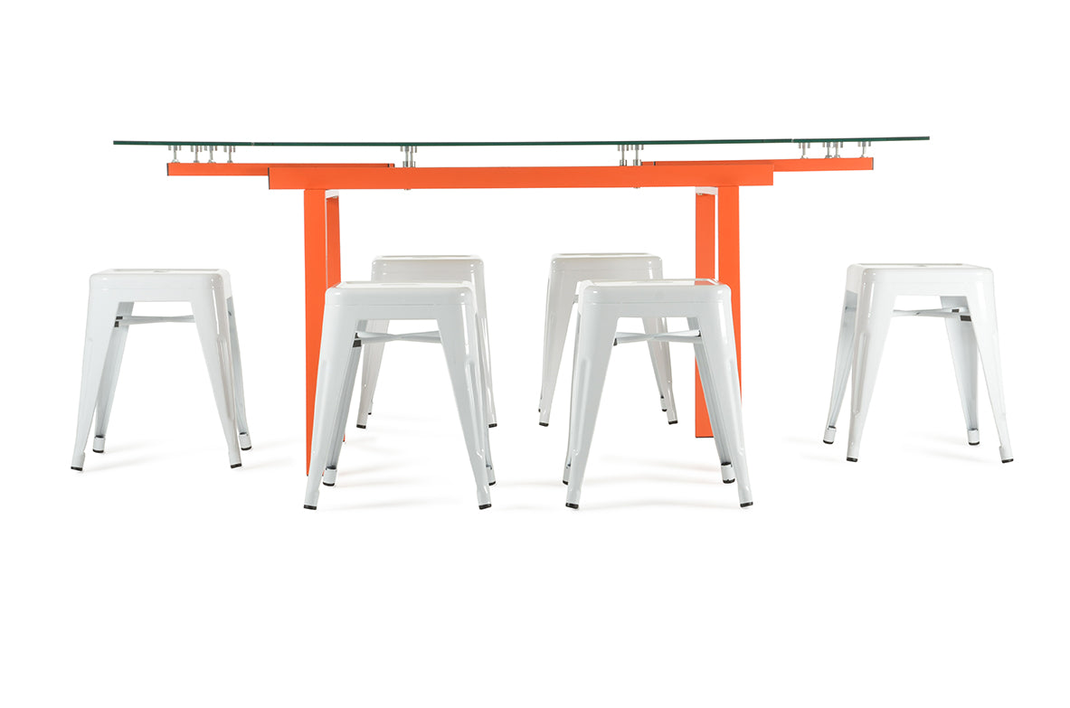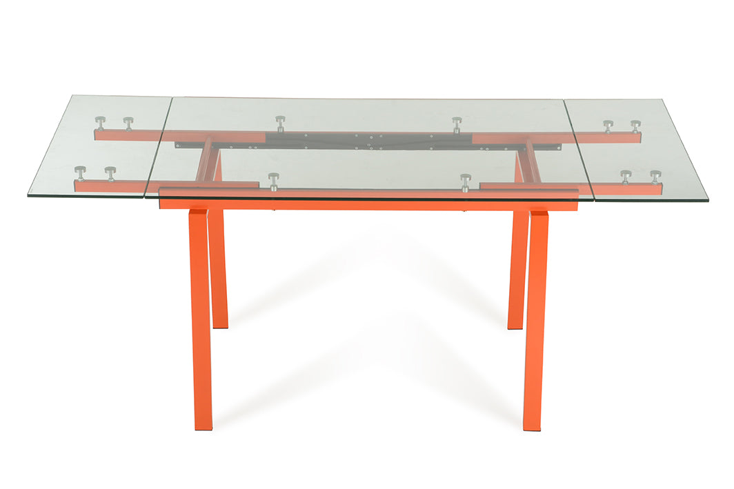 The Modrest Linus Contemporary Glass Extendable Dining Table features an eye-catching combination of materials and color. It features a 10-mm 3-piece clear tempered glass sitting on a powder-coated orange metal frame. This contemporary glass top dining table is capable of sitting more people as it extends up to W47/59/71" x D32" x H30" and requires some assembly.