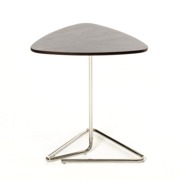 The Modrest PTXA1044 Modern Brown End Table exhibits uniqueness featuring an almost triangular-shaped brown veneer top with rounded edges. It stands on a sturdy chrome base that imitates the "triangle" hand percussion instrument.