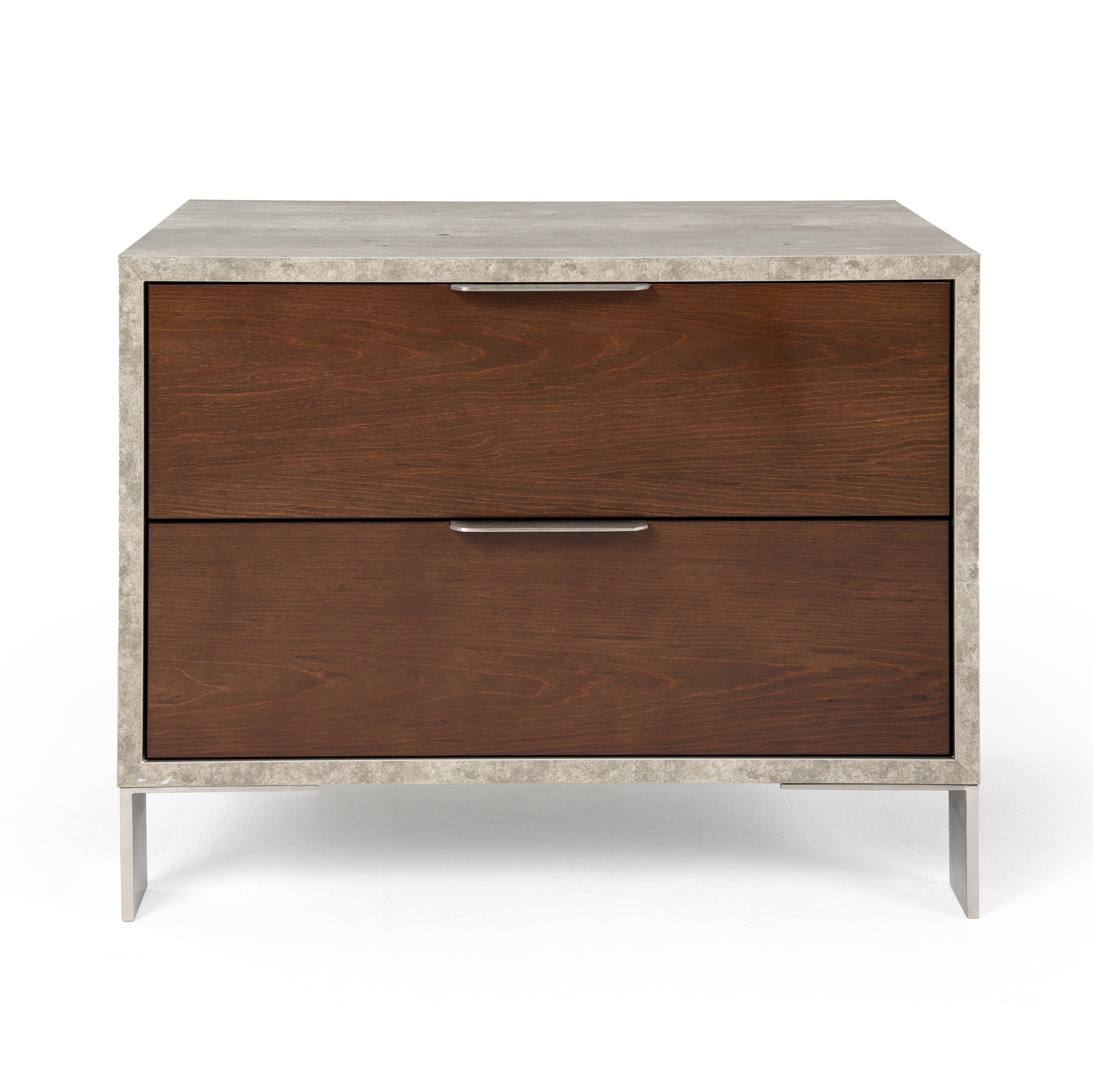 The Nova Domus Conner Modern Dark Walnut & Concrete Nightstand displays a refined appeal featuring a dainty 3/4-inch grey concrete body. It features 2 soft-closing drawers accentuated with brushed stainless steel handles and legs. This modern nightstand has a dimension of W26" x D18" x H20" and requires some assembly.