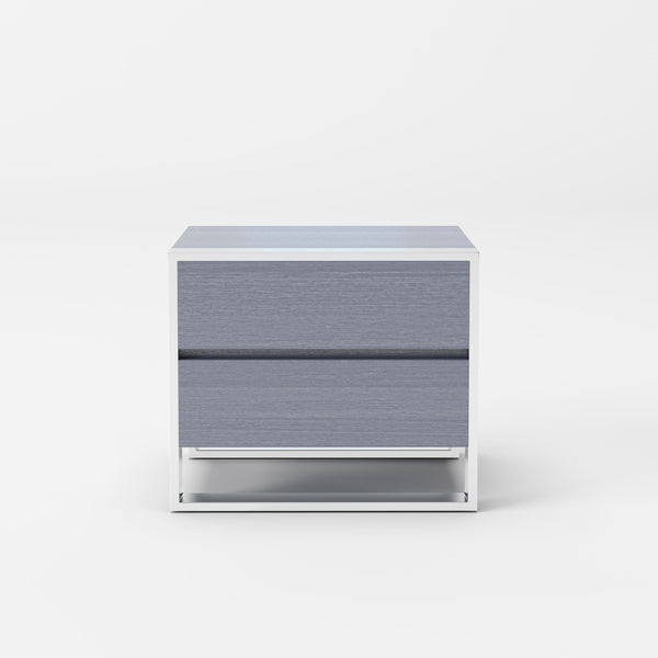 The Jolene Nightstand is the perfect modern example of design. The grey oak veneer of the two drawers is smooth and modern. Surrounding the front and back of this piece is a polished stainless-steel frame that contrasts the grey of the drawers. All drawers are self-closing creating a truly contemporary piece.