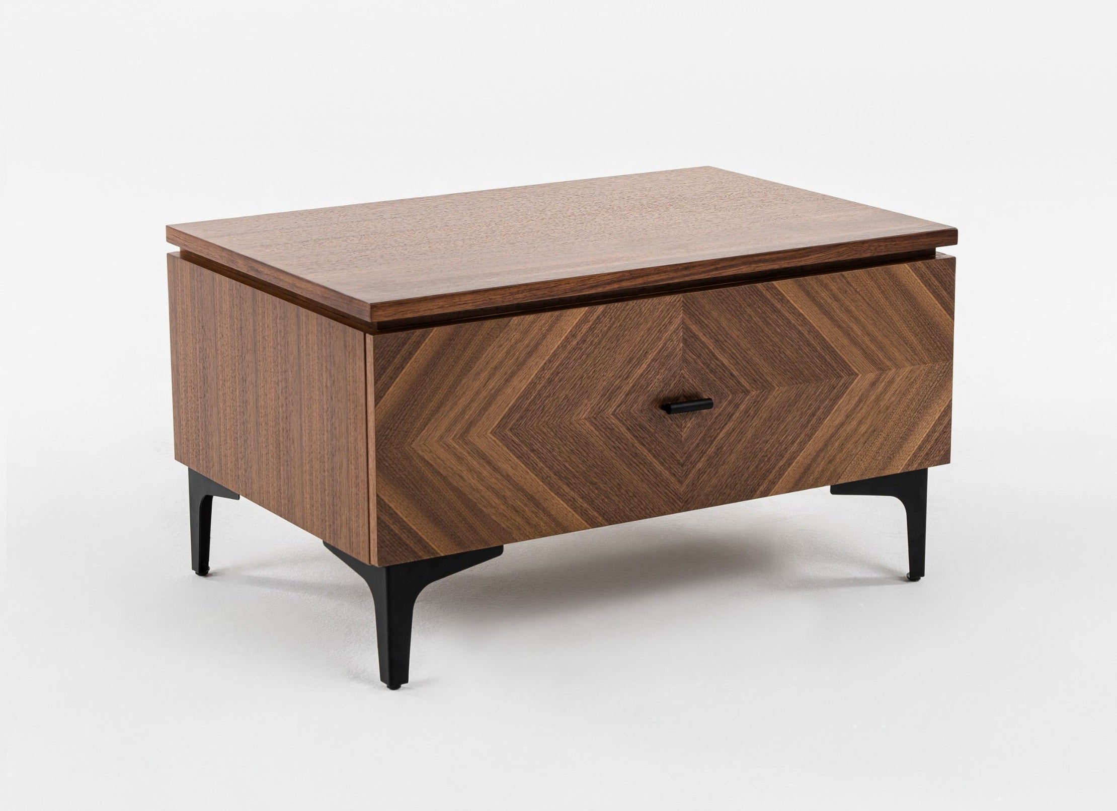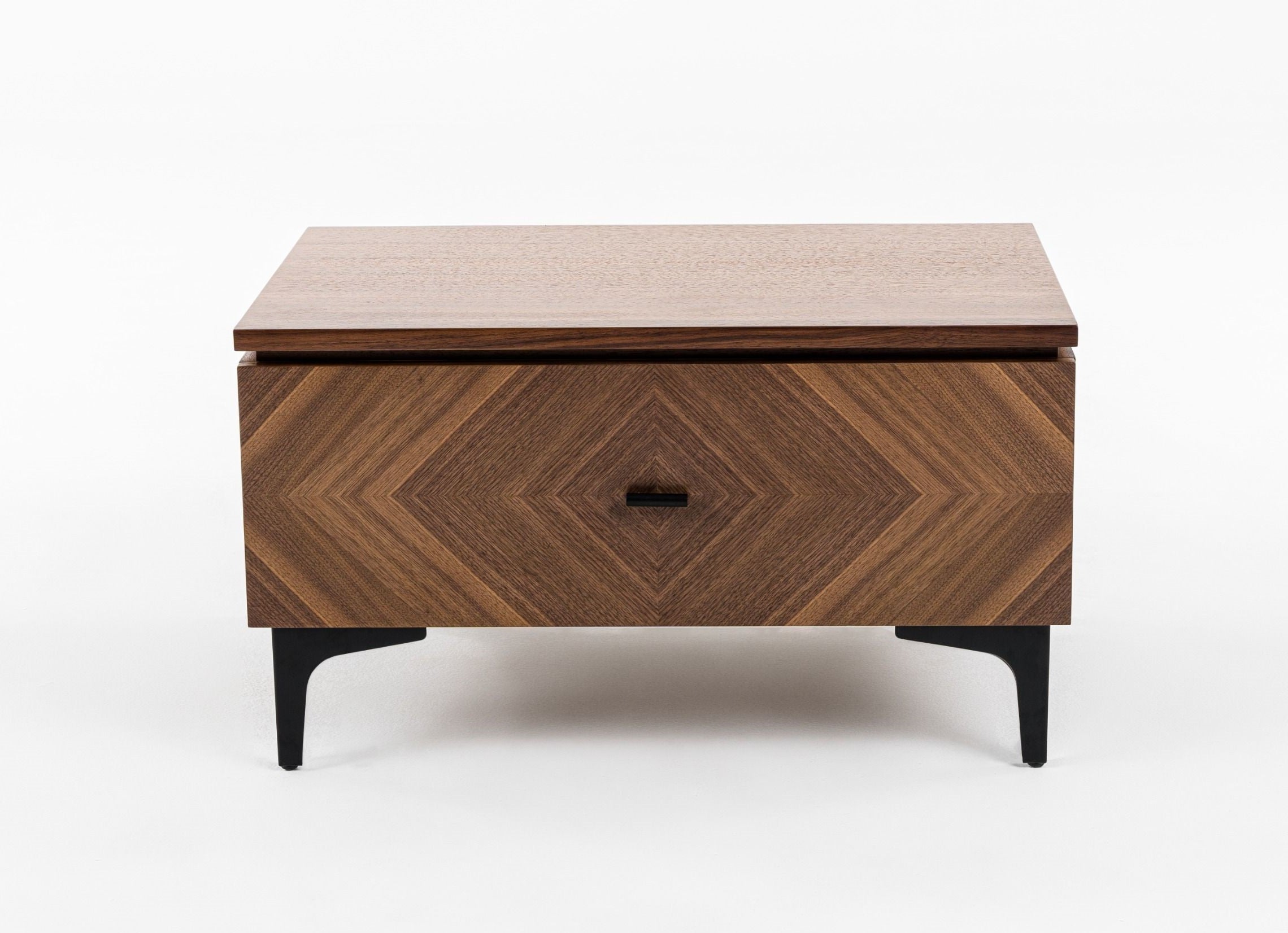 The Paula Nightstand is presented in a Mid Century Style. The walnut veneer has a Parque look by using alternating grain. The black metal accents contrast well with the walnut. The texture and style of this piece make it perfect for your industrial, farmhouse, or mid-century home. Style with the matching Paula pieces.