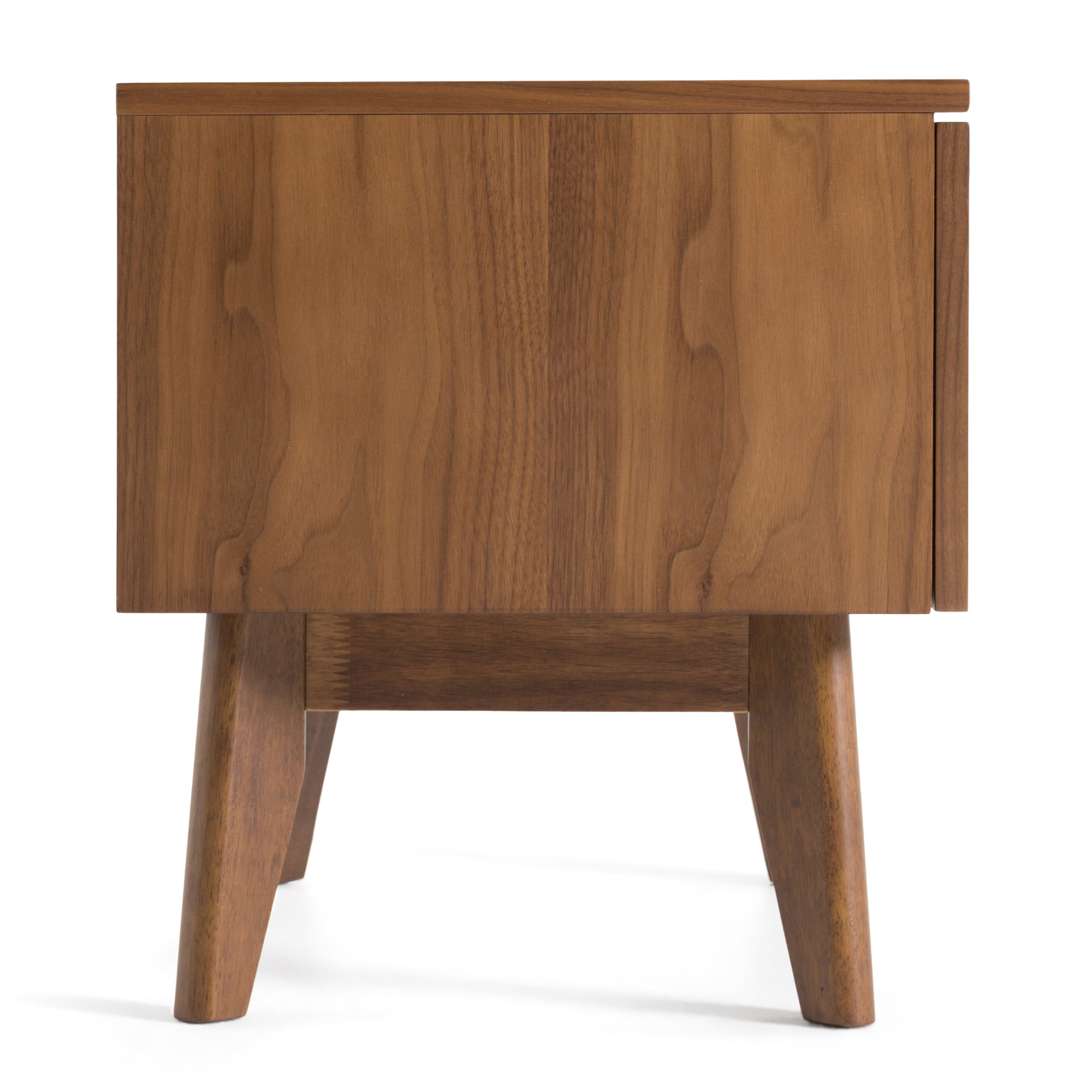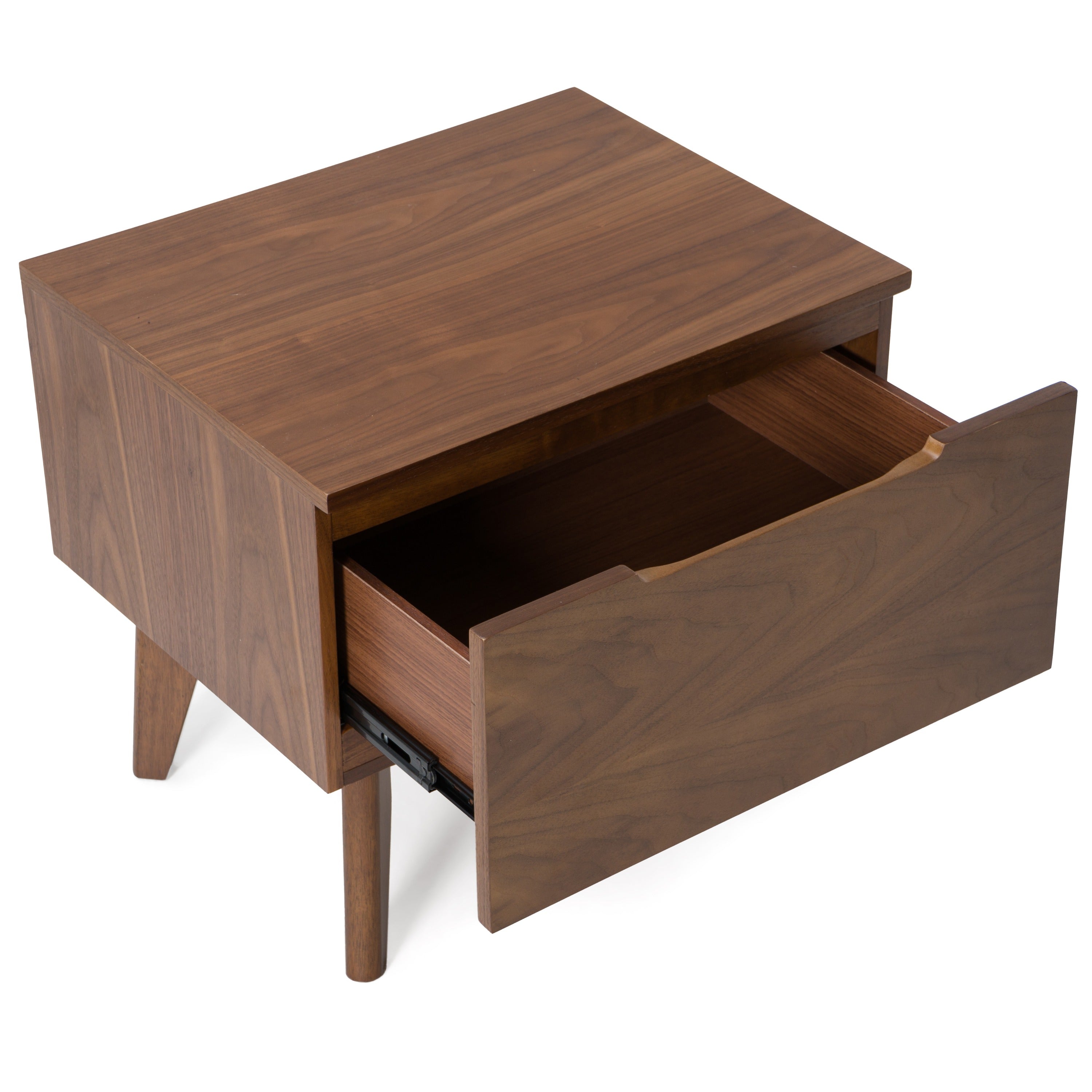The smooth Walnut Veneer finish of this Modrest Lewis Mid-Century Modern Walnut Nightstand makes it an eye-stealer. Furnished with a single cavernous drawer, it features wood markings on the surface and a rectangular hollowed area on the upper portion of the drawer that functions as drawer pull. Walnut finished solid Rubberwood tapered legs keep this modern nightstand standing on the floor.