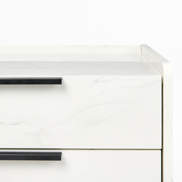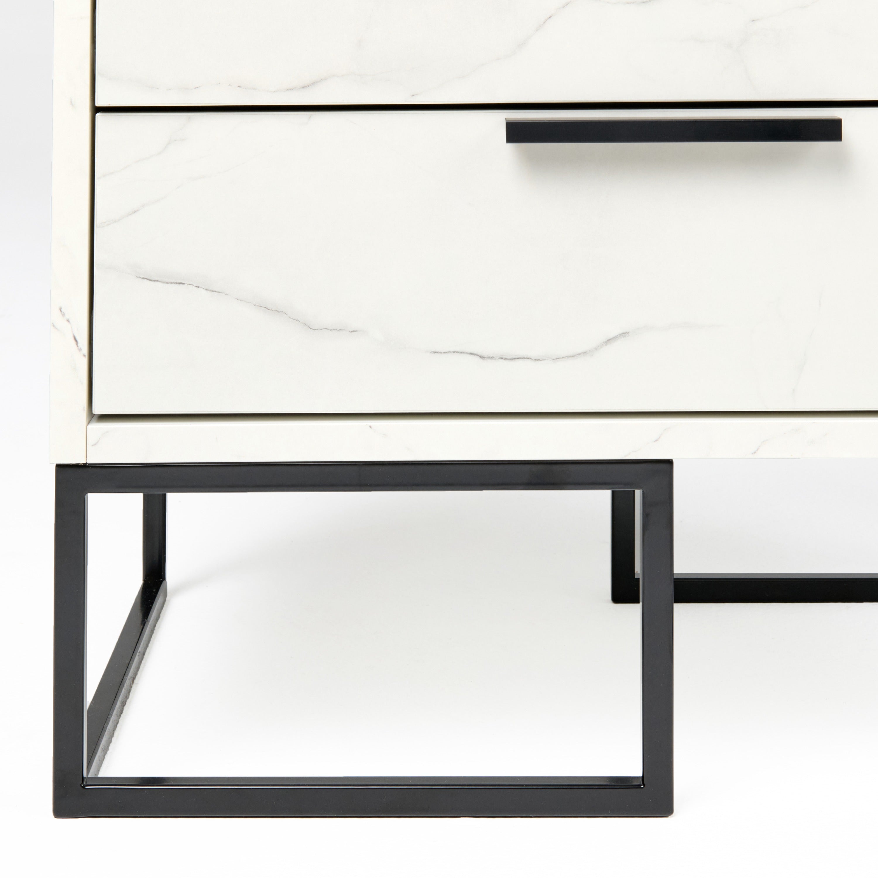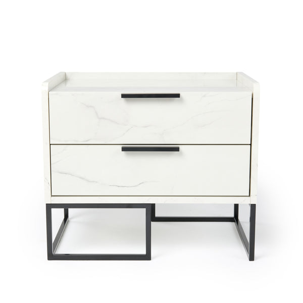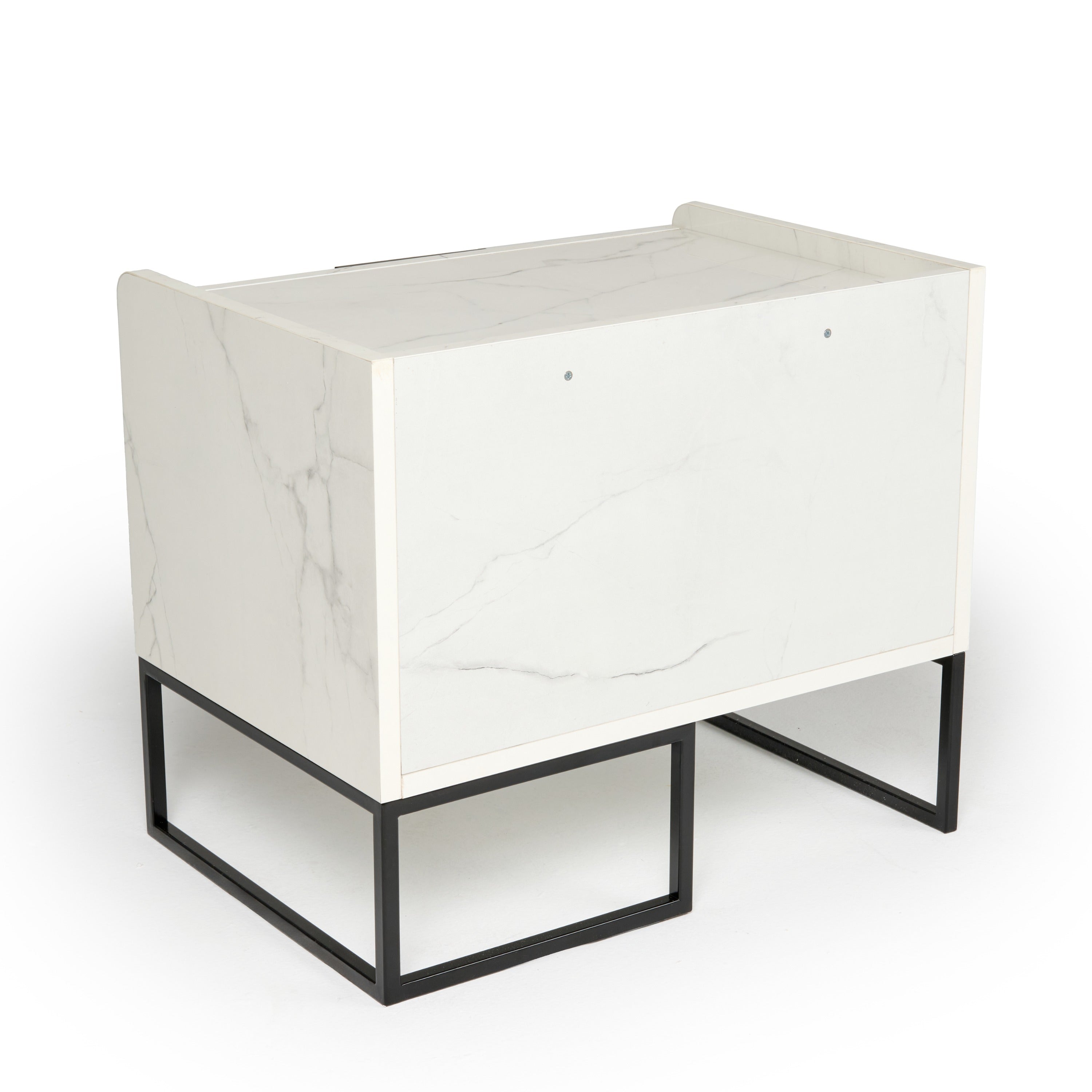The Marbella Modern Nightstand is finished in a lovely white marble veneer that stands out in any bedroom. The black metal legs contrast with the marble and the sulptural base makes a contemporary statement. Sitting low to the ground, this nightstand fits perfectly with a platform style bed.