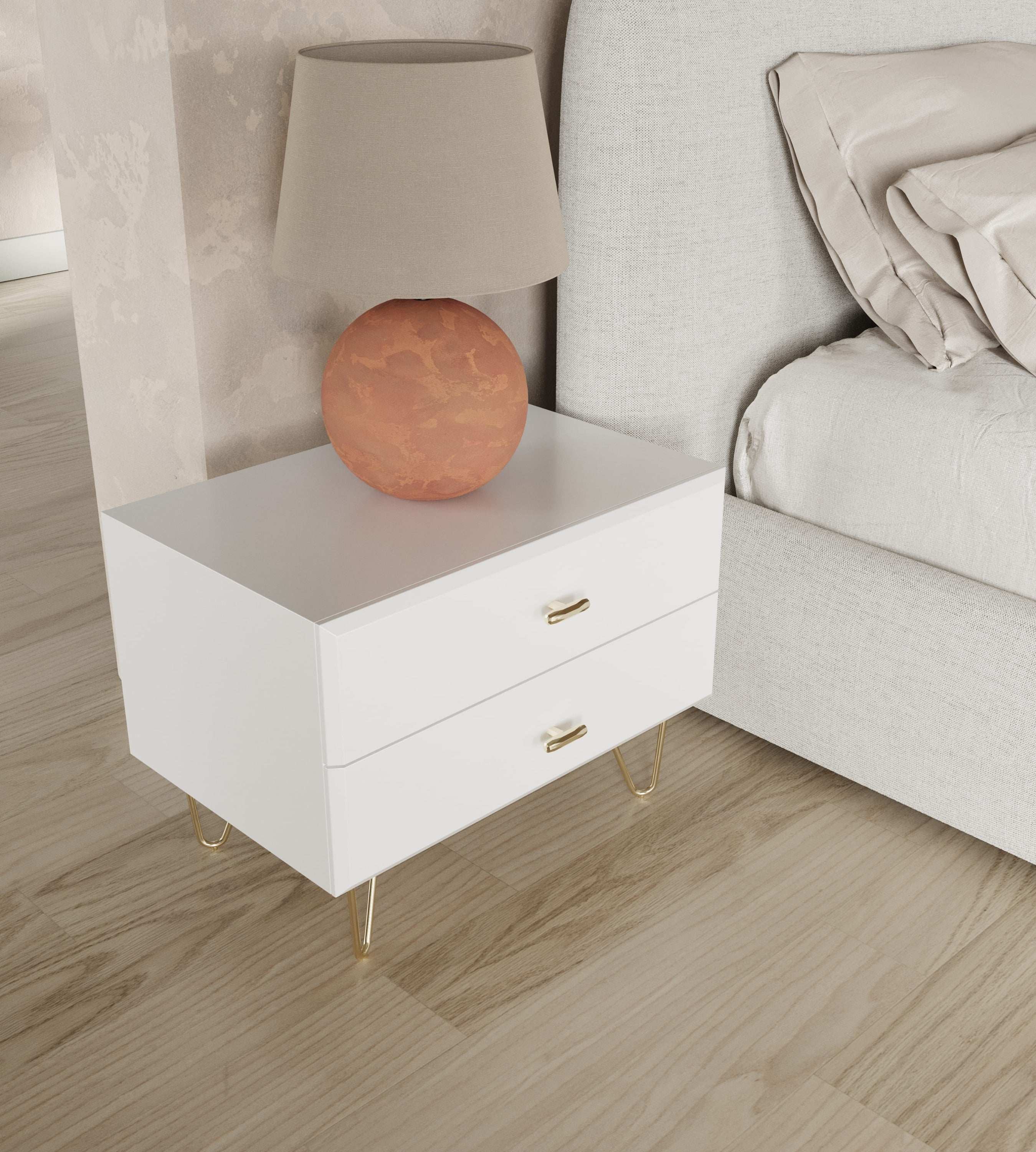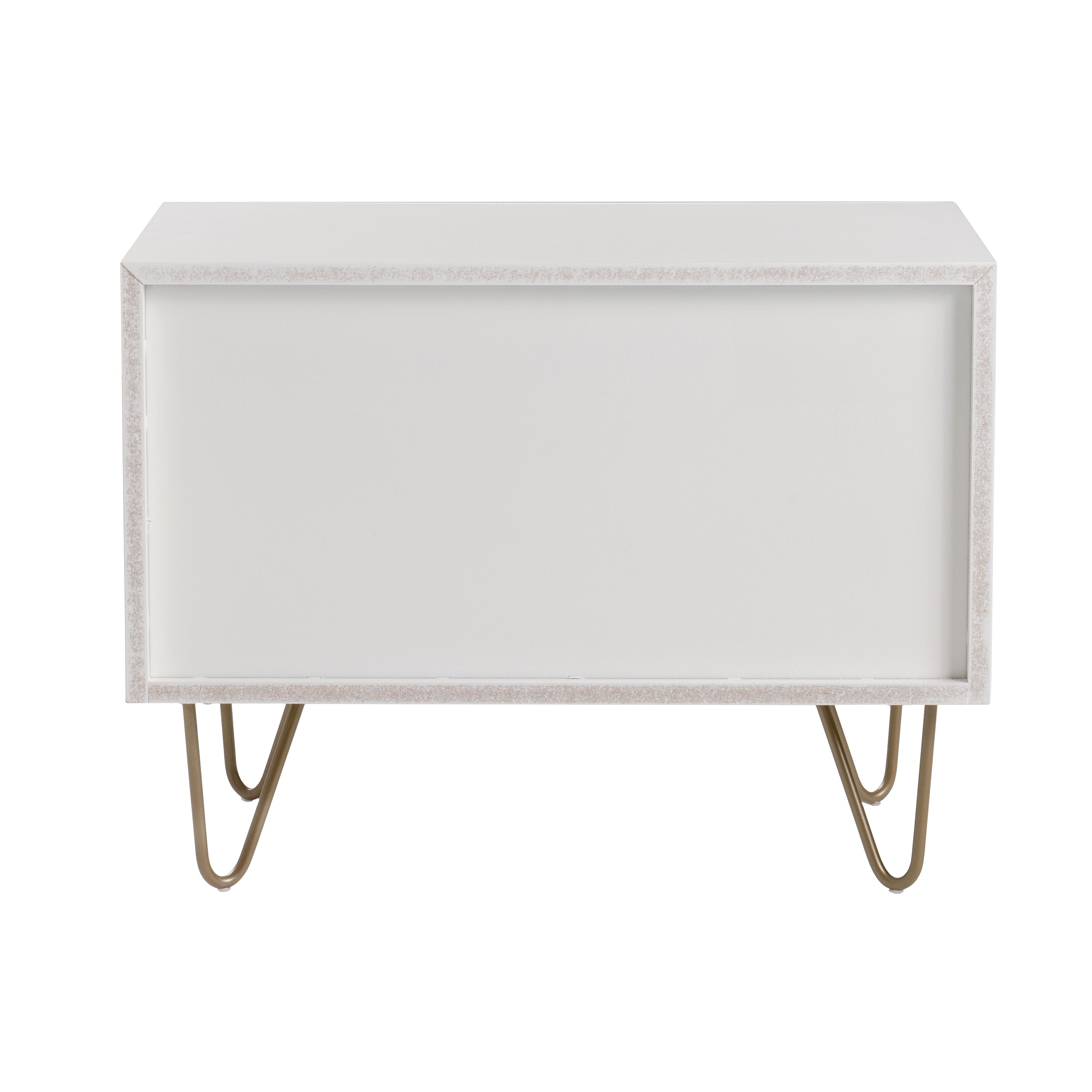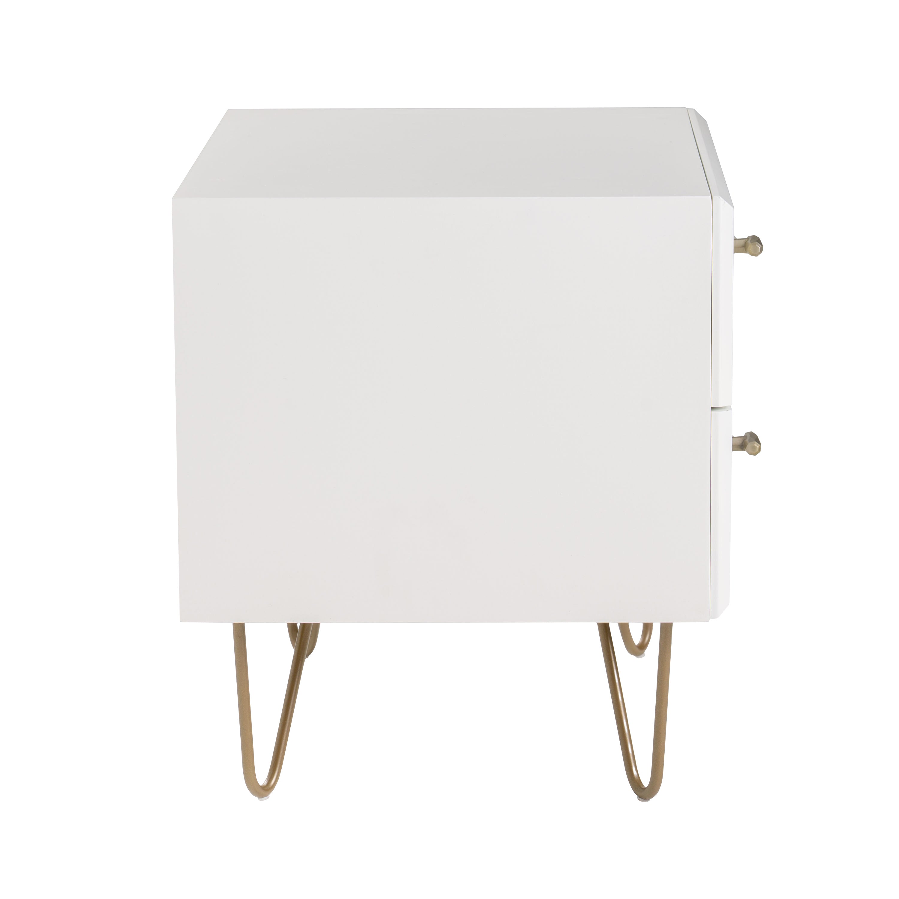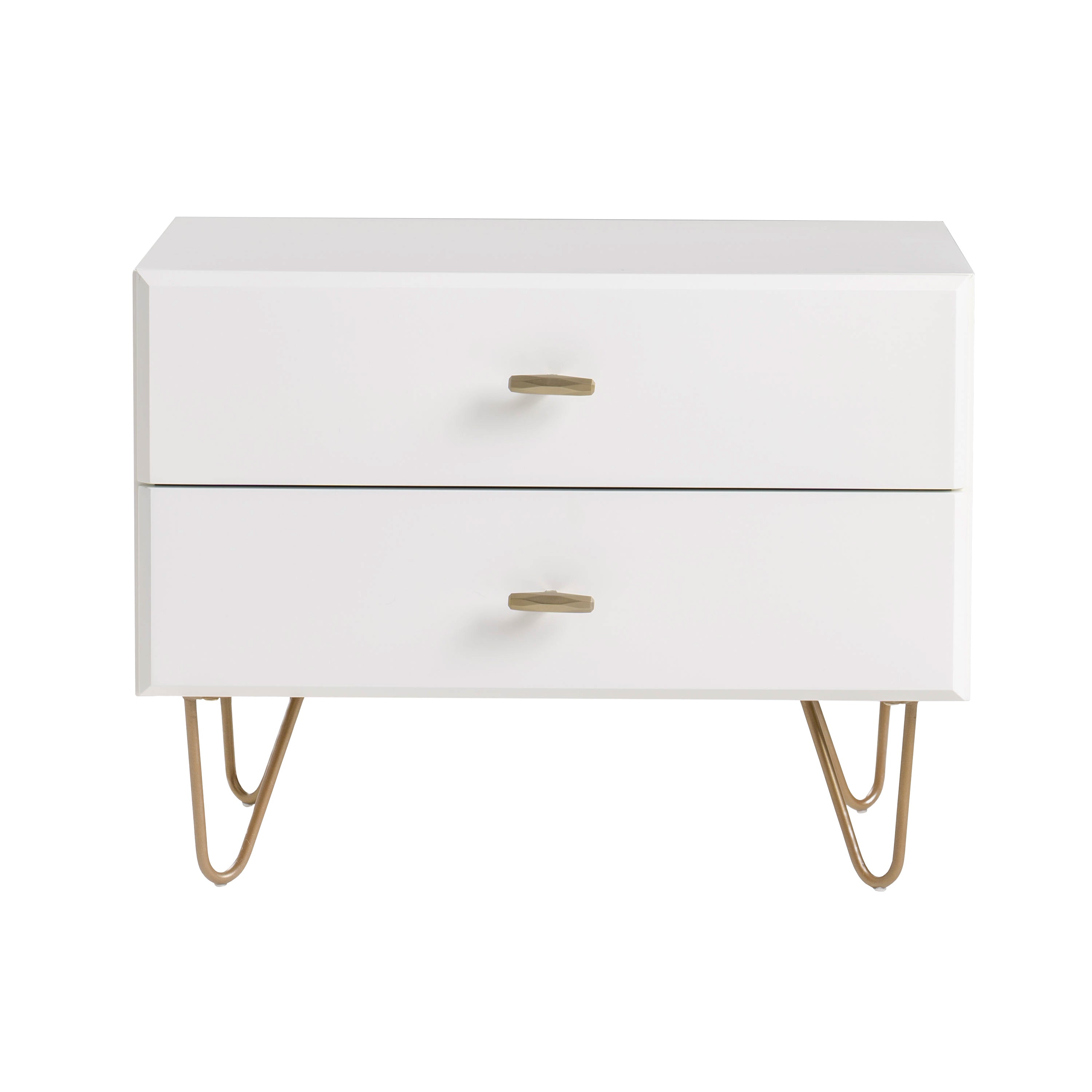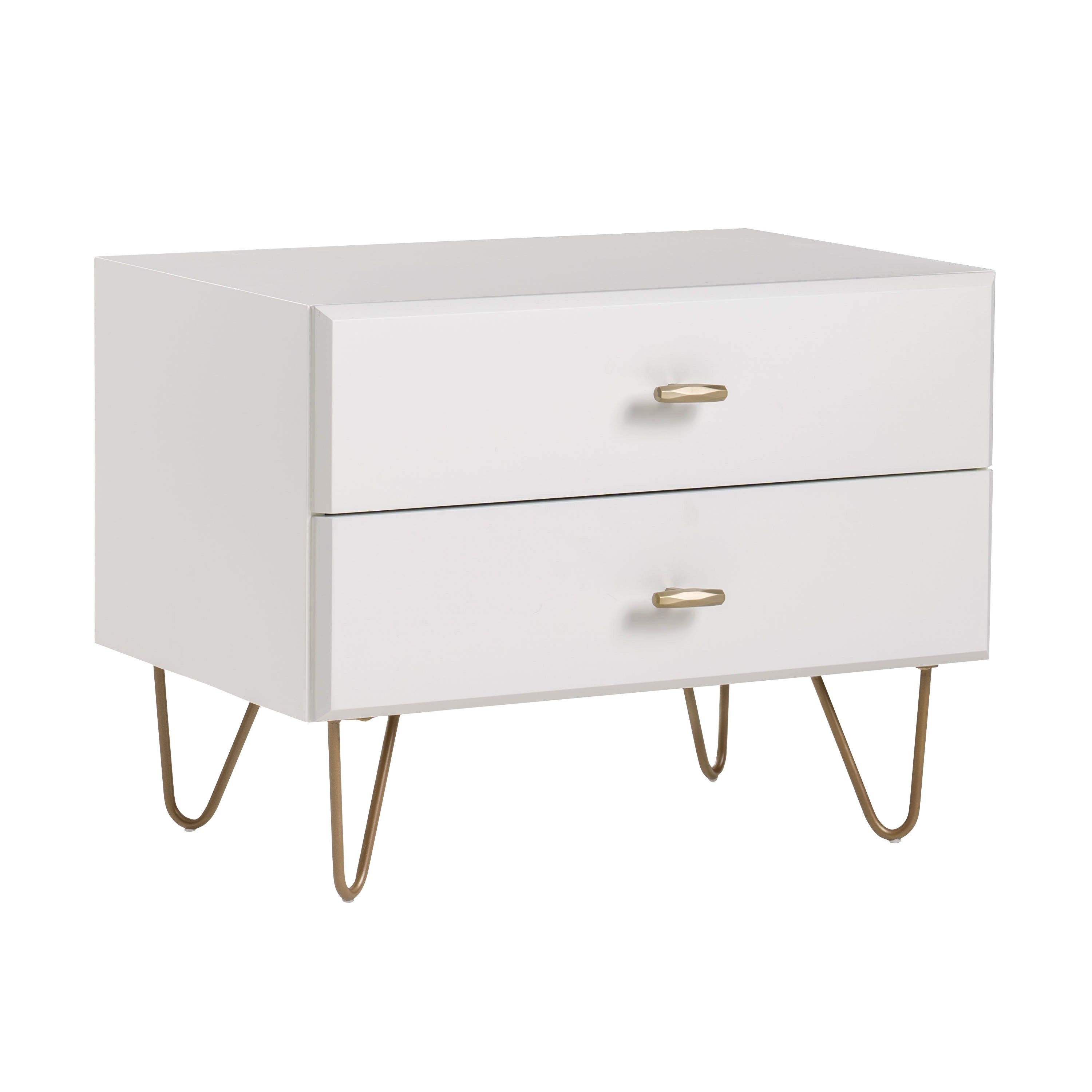 The right details can elevate a standard design to crave worthy results. This is especially true of the Bryan series and its Nightstand. Its simple rectangular shape has a white finish on the frame and two soft-closing drawer fronts. A little metal contrast is achieved with brushed gold metal on the drawer pulls and angled powder-coated feet below. A great match for other Bryan series items. Some assembly is required.