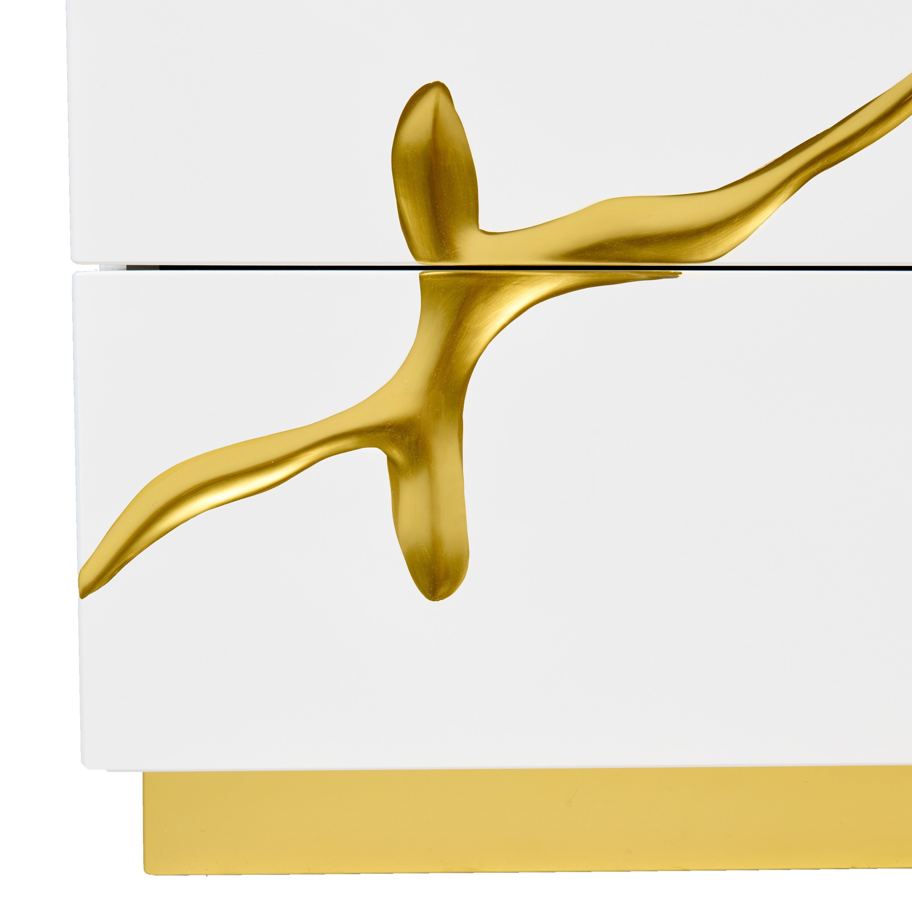 Creative craftsmanship emanates from the Modrest Aspen Modern White & Gold Nightstand. Featuring a lustrous white high gloss finish, it has two spacious soft-closing drawers with pulls located on its side. Artistic gold-painted accents that simulate tree branches provide visual appeal along with the hefty brown-colored base. Its top is wide enough to accommodate items within easy reach while in bed. Beyond the storage aspect, this fully assembled modern Aspen nightstand lends your bedroom a lavish, stunning look!