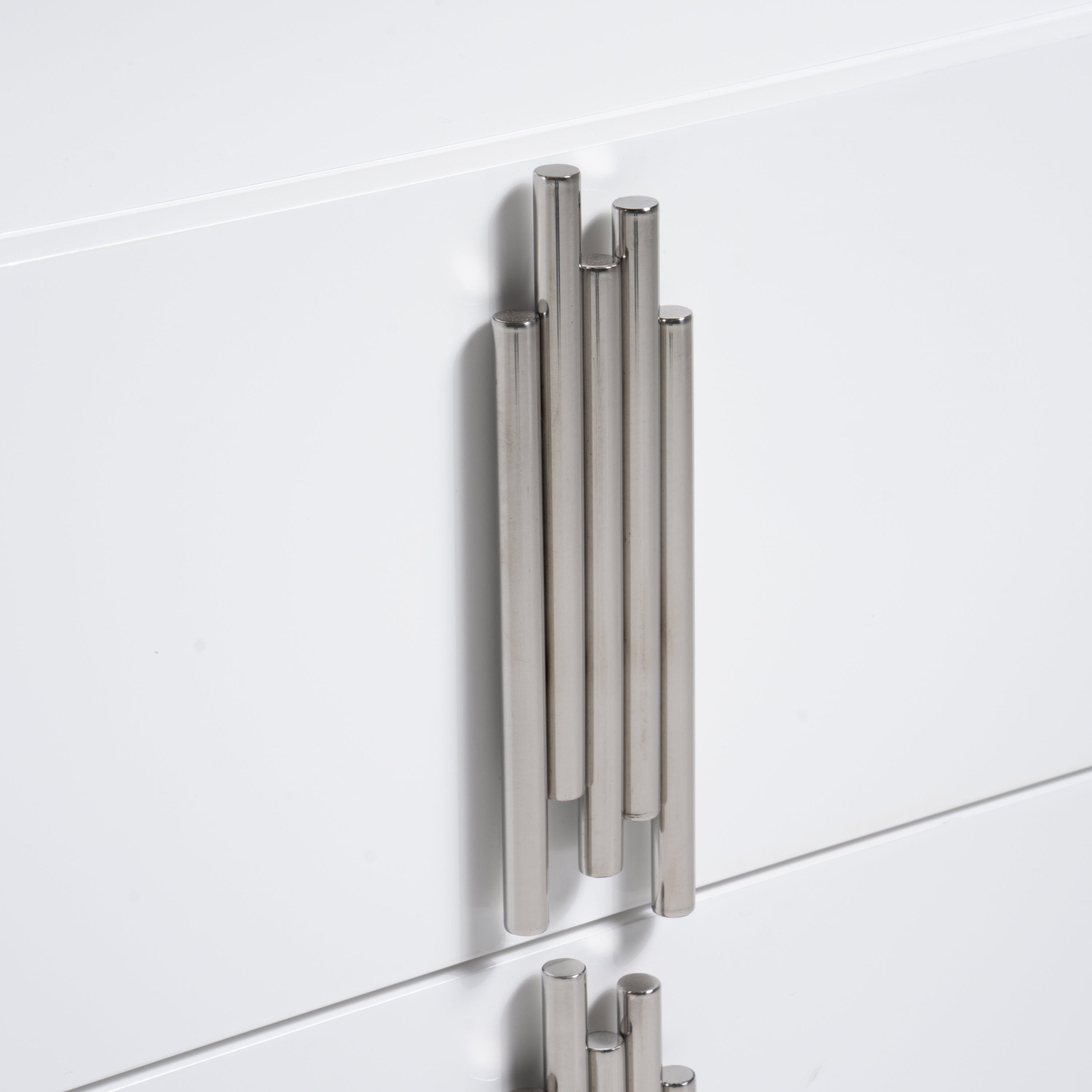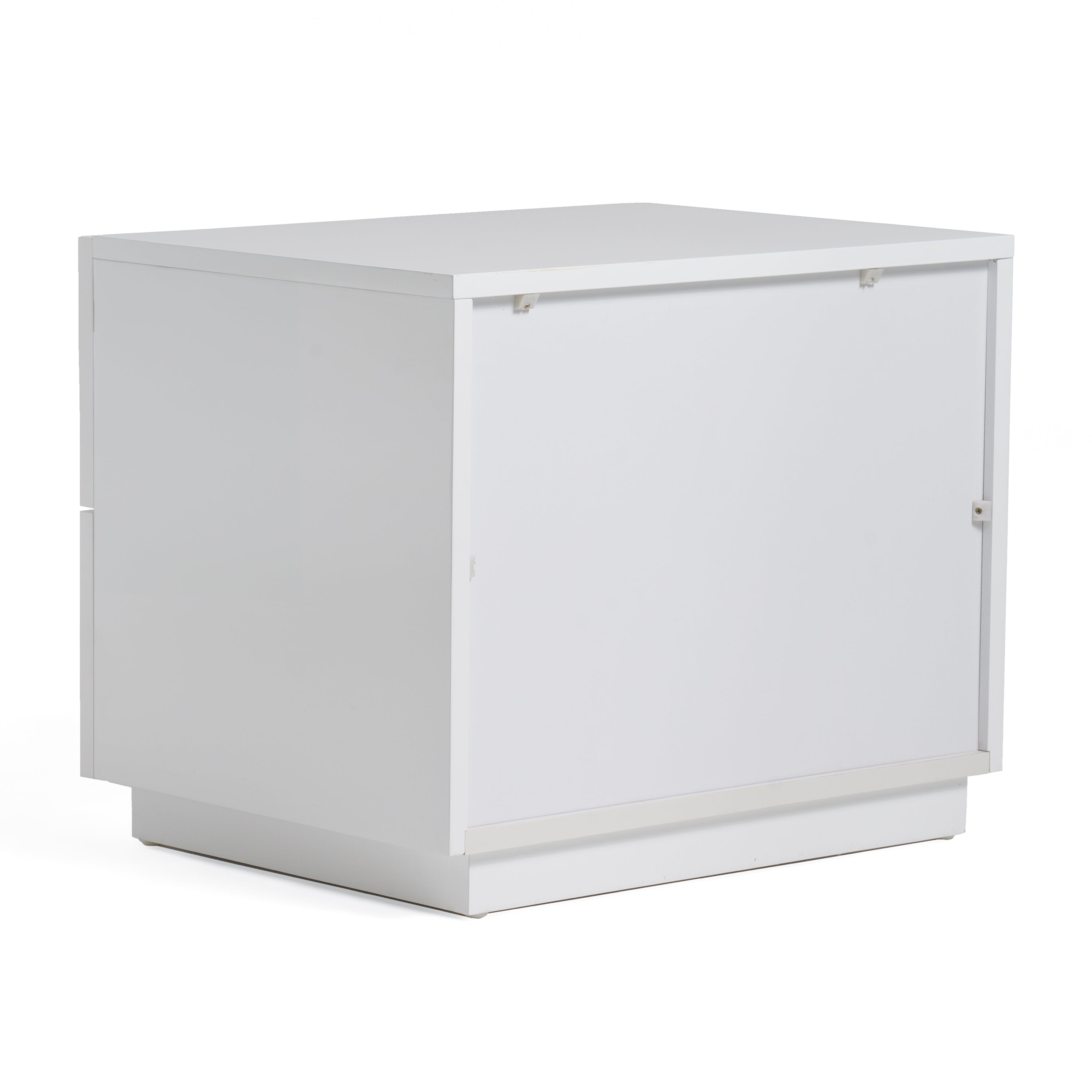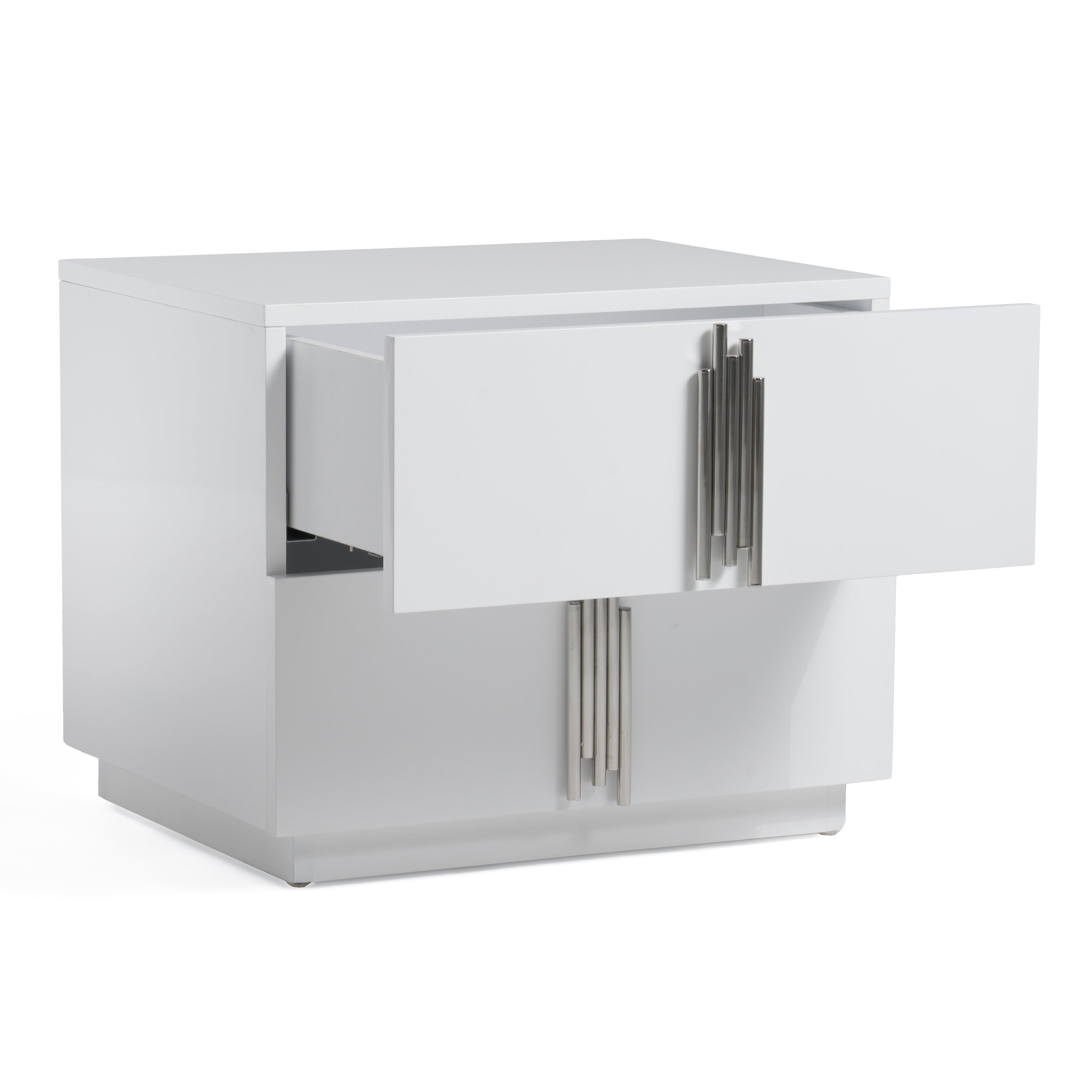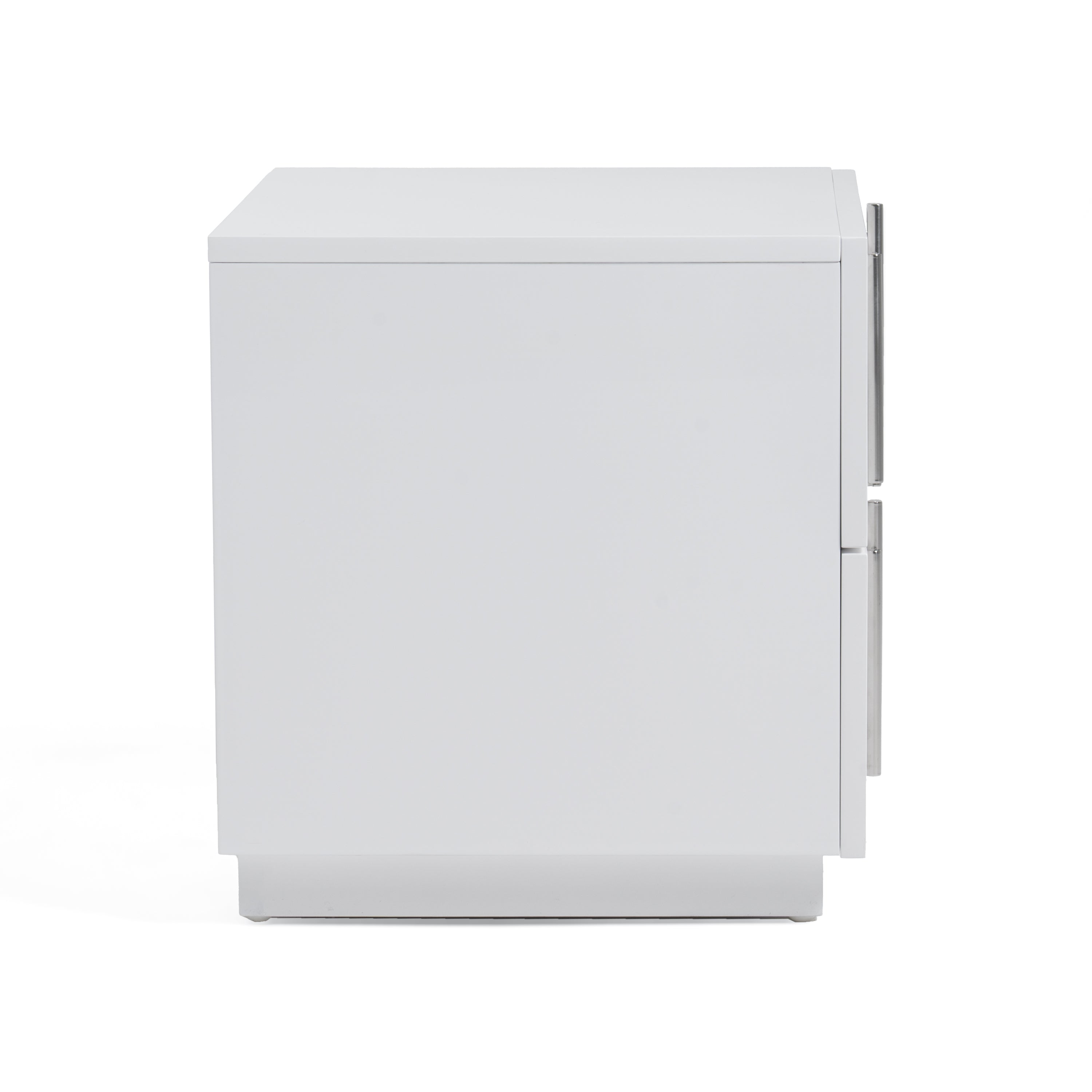 Featuring two spacious drawers and bold style, this square nightstand will bring modern design to any bedroom. Using a white high-gloss finish, this table blends with any decor while standing out as a quality piece of furniture, highlighted by the interesting stainless-steel handles. The vertical style of the handles is striking, and give the entire nightstand a very different, modern style all of their own.