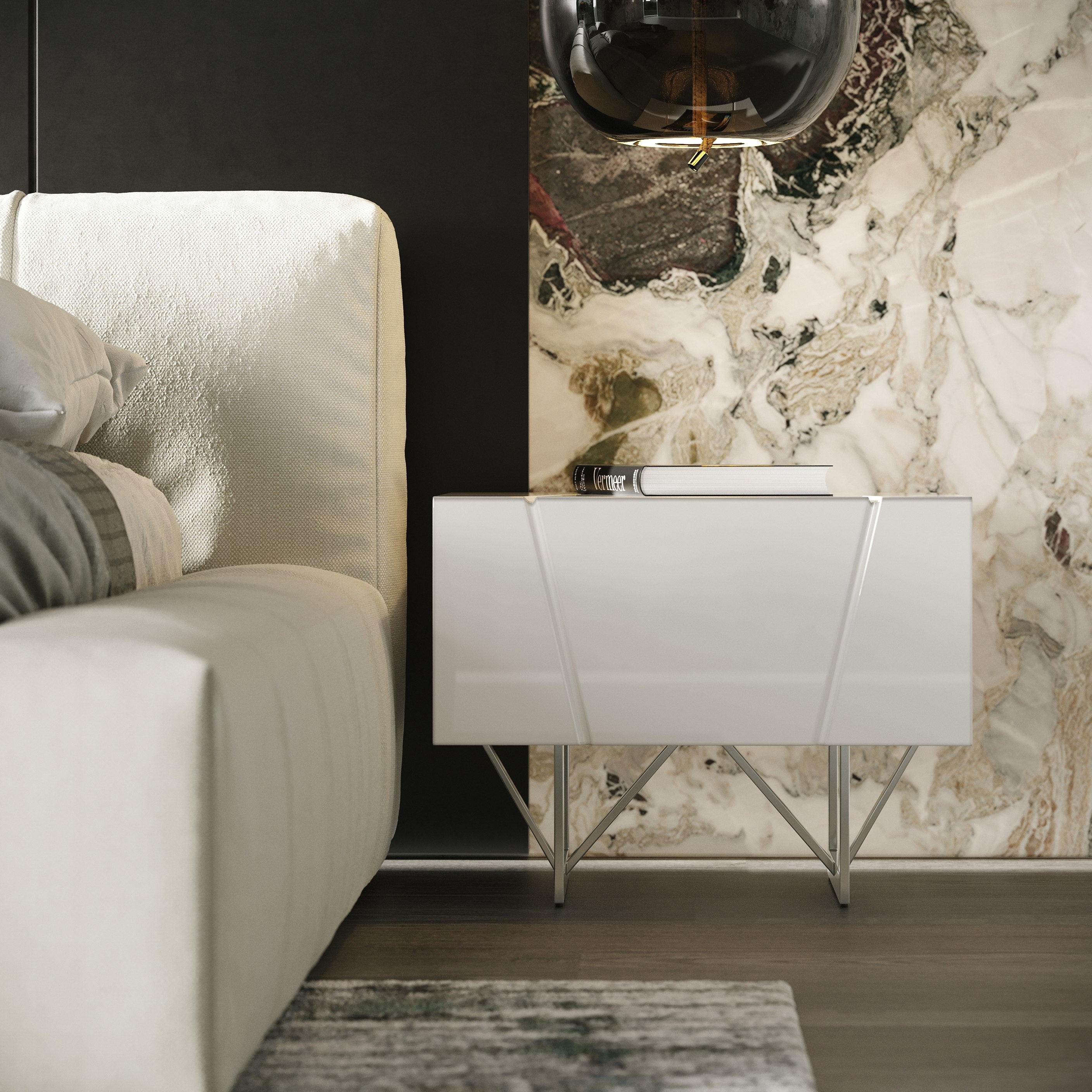 The Chrysler Nightstands supports your modern needs in every way. Adding luster to its boxy structure is the suave high gloss finish punctuated with diagonal cutouts. Fitted with a single drawer that glides easily and closes quietly, this nightstand keeps essential items nearby. Stainless steel hairpin legs finish this lovely piece to complete the mod styling.