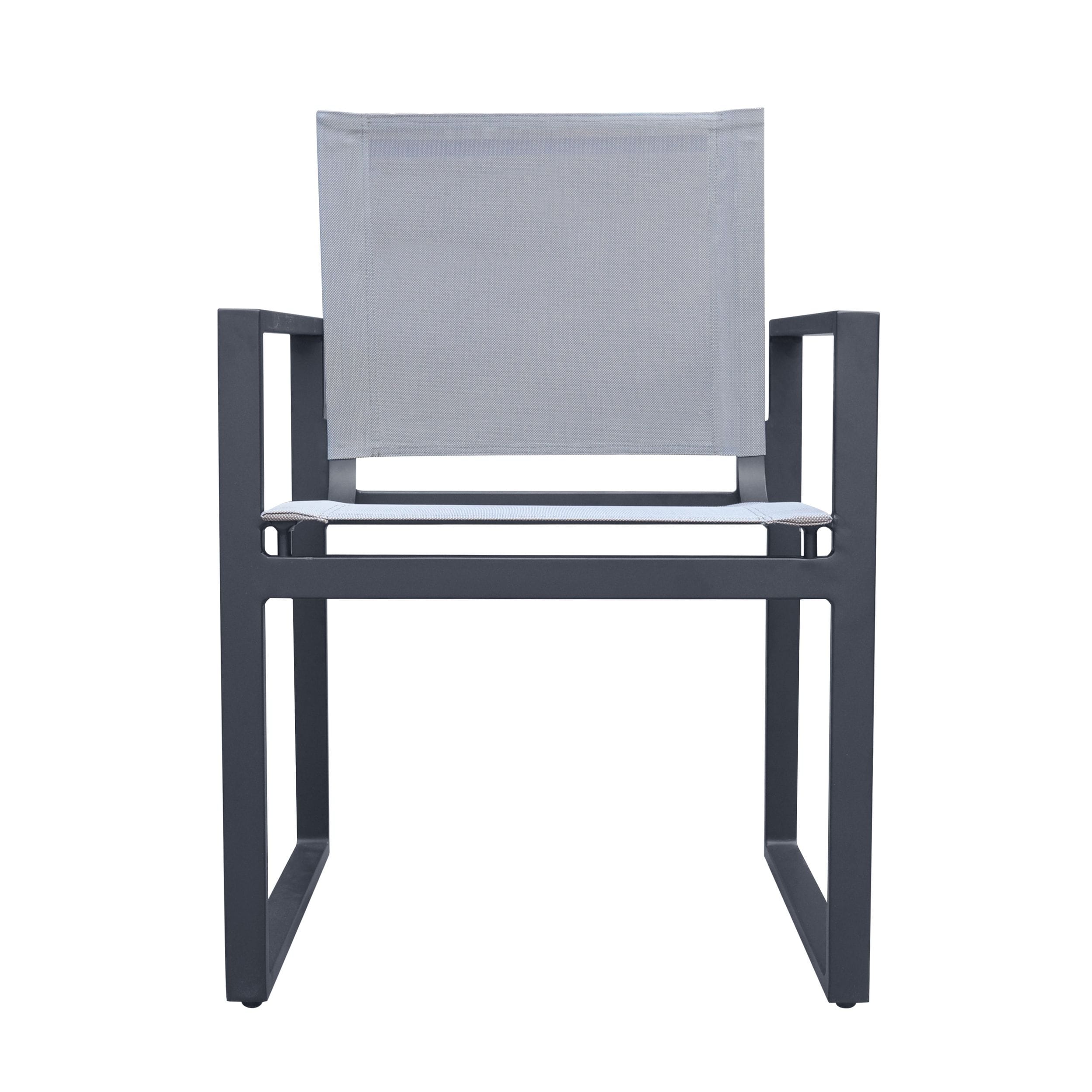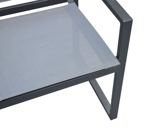 Lounge in style with the Kayak Outdoor Armchair with an aluminum dark charcoal metal frame and sling fabric seat and backrests.