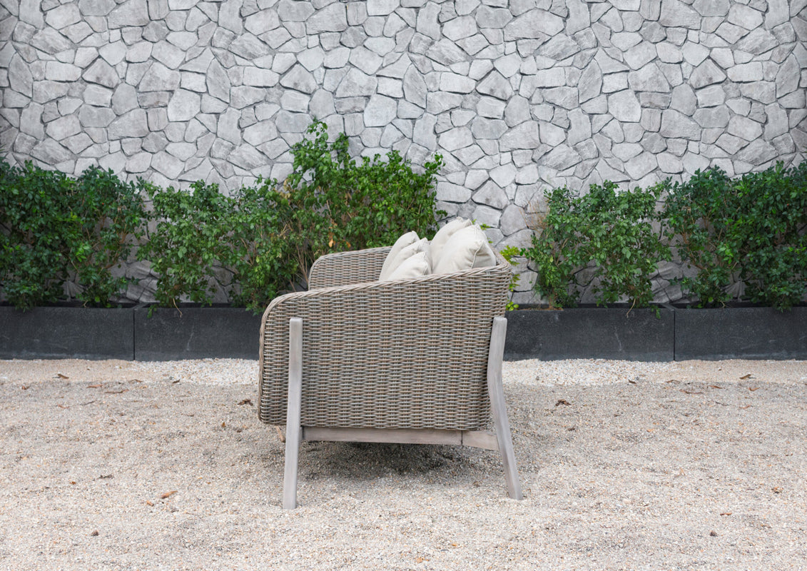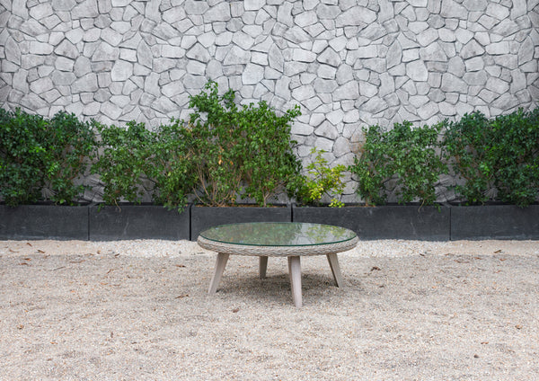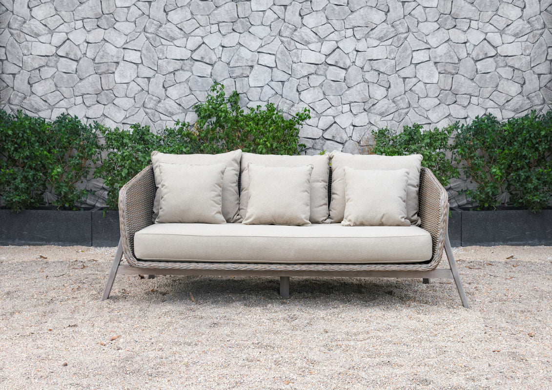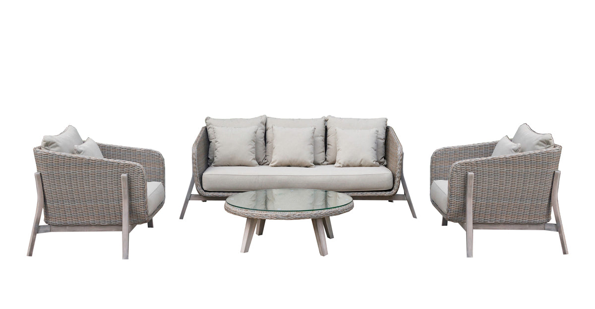 Exuding a refreshing allure is the Renava Carillo Outdoor Beige Wicker Sofa Set. This sofa set has a sturdy Aluminum frame wrapped in brown poly rattan wicker complimented by beige waterproof fabric back and 6-inch thick seat cushions. The back flows continuously to form its arms, giving that sloping look that curves downward. Five square throw pillows come with this sofa set to further boost its comfort-ability. The round table has an 8mm clear tempered glass top for easy maintenance. Have a calming break by yourself or with the family or friends with this wicker sofa set that gets support from tapered grey wood legs.