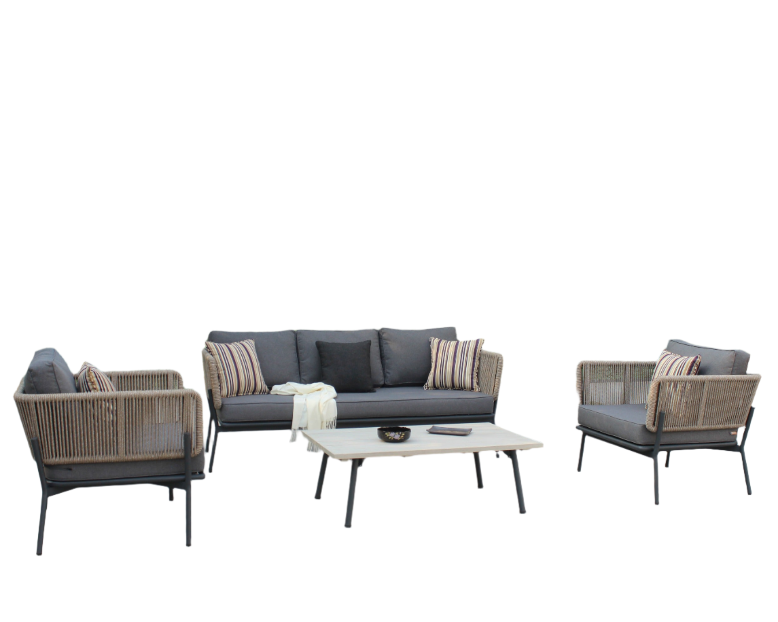 - Set Includes: Outdoor Sofa, 2 Outdoor Chairs, Outdoor Coffee Table & 3 Toss Pillows