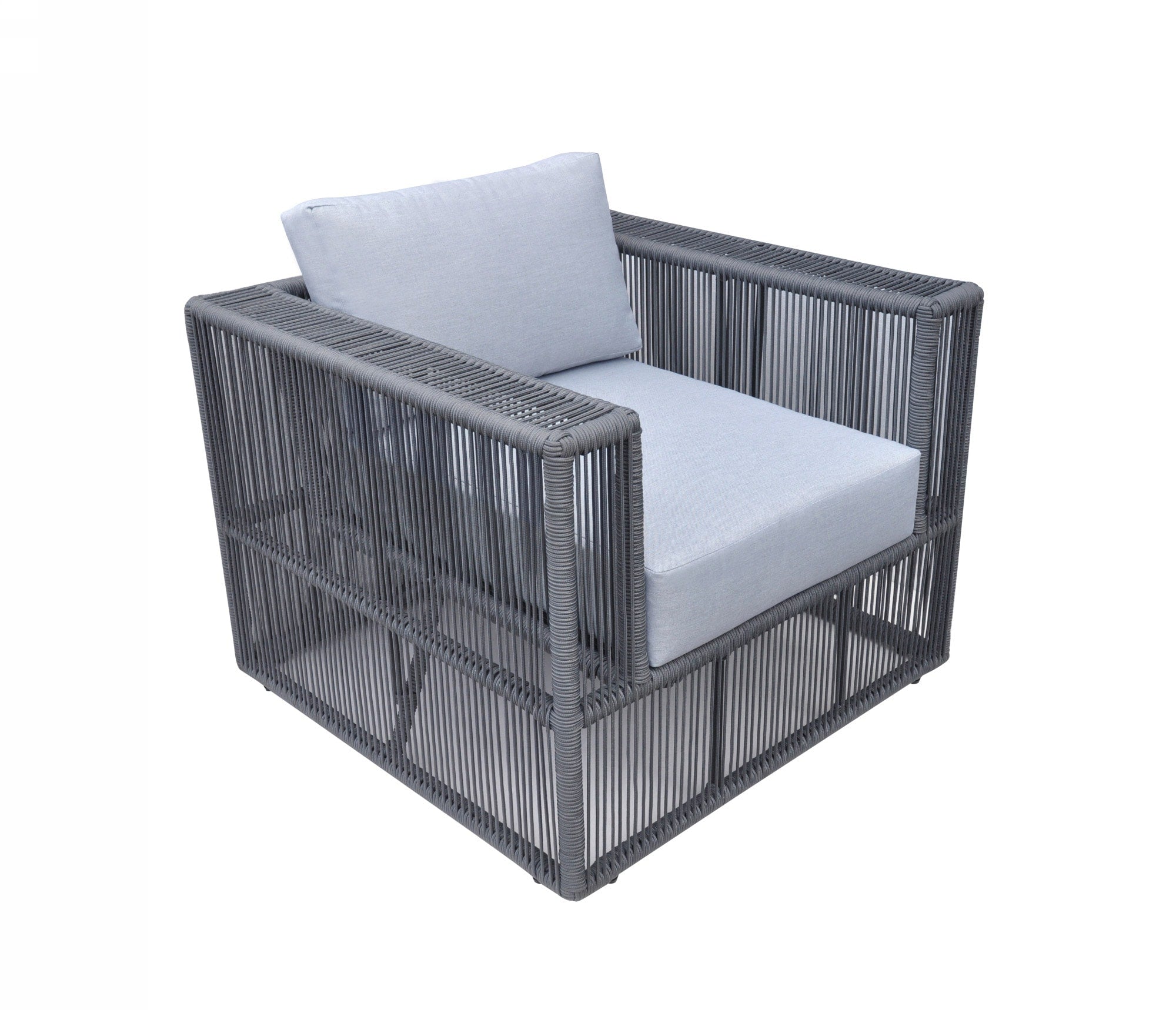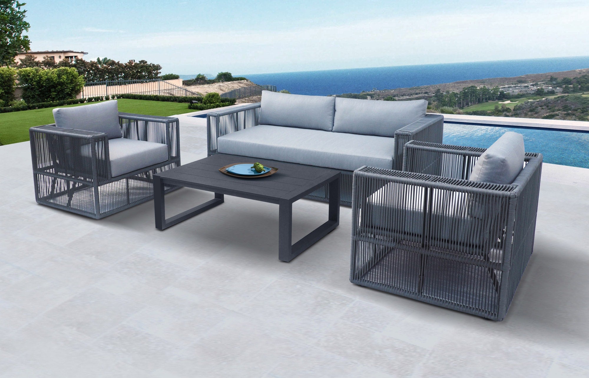 The Whimsey Modern Outdoor Light Grey & Dark Grey Sofa Set comes with two accent chairs, a loveseat, and a coffee table. The dark grey rope weaves over the sturdy aluminum frame created a deconstructed, industrial look. The upholstery is executed with a light grey waterproof fabric, meant to withstand the elements. Perfect to showcase your farmhouse style porch.