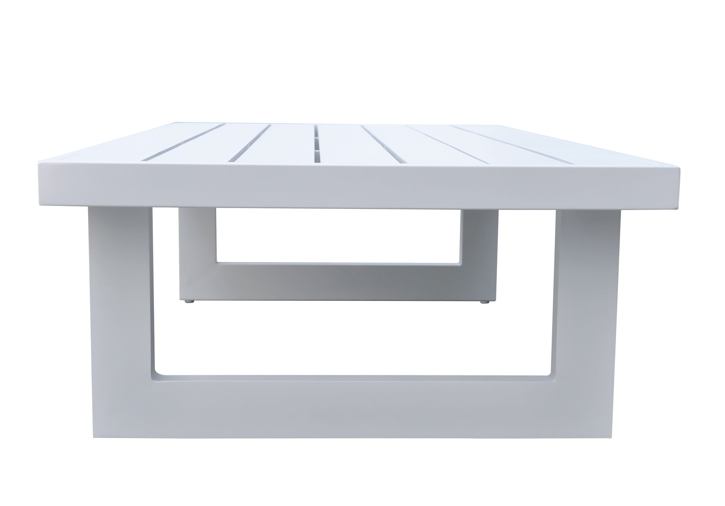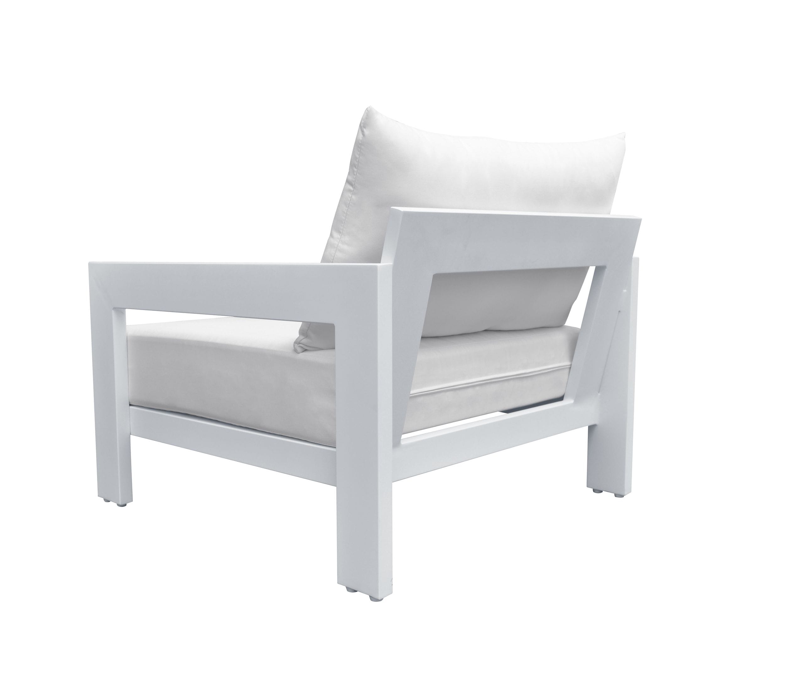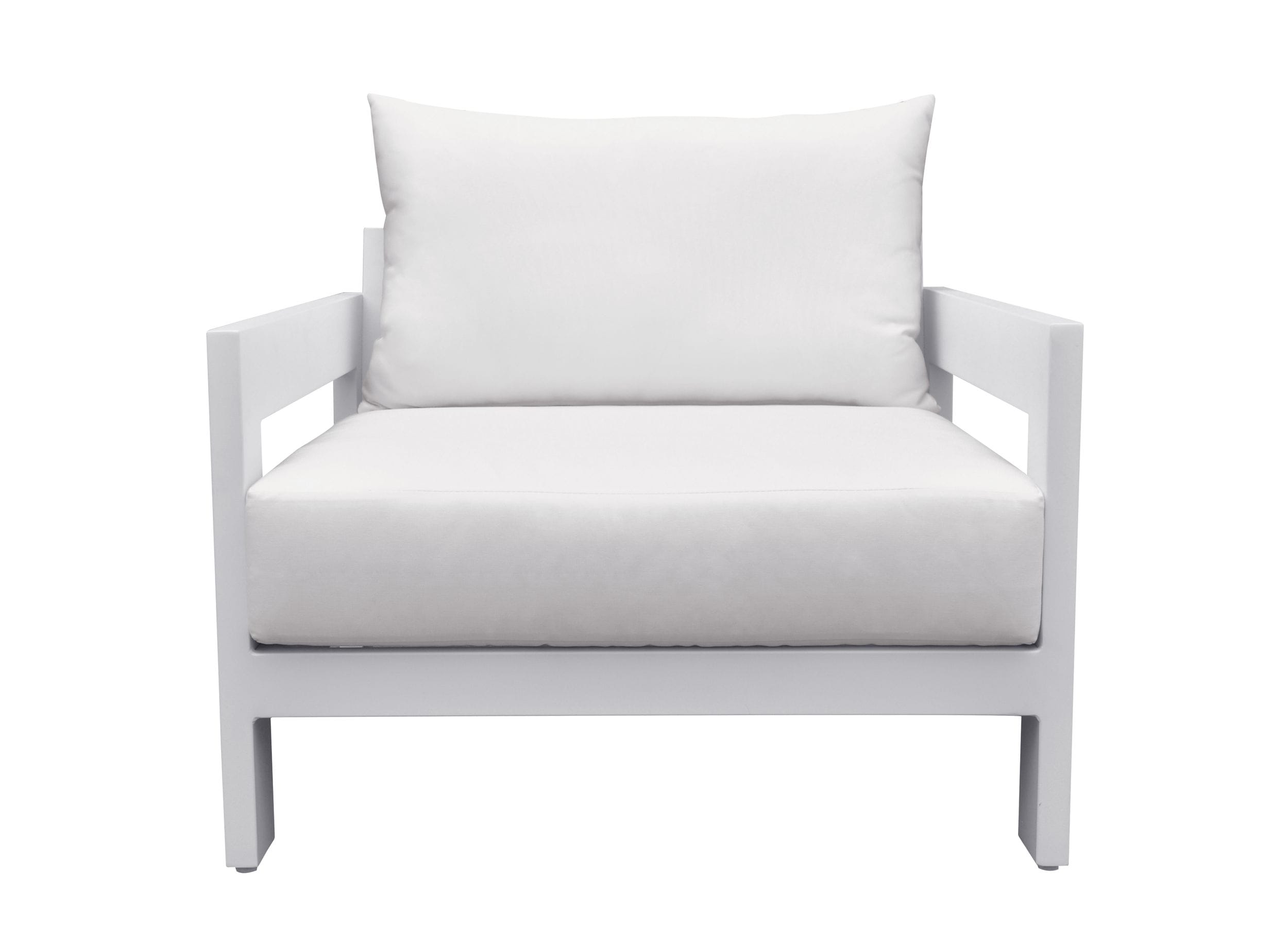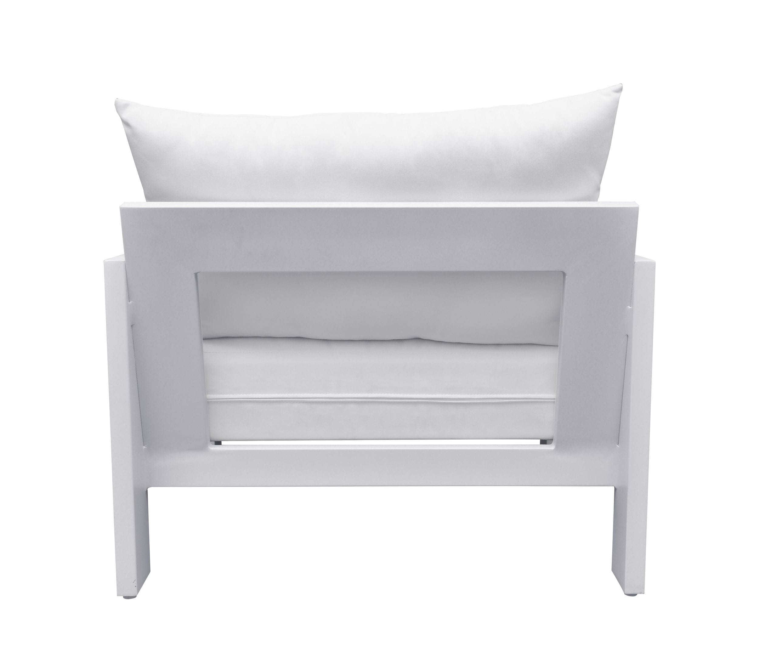 Our Renava Wake Outdoor Sofa Set is designed to be comfortable, inviting and durable. The off-white removable cushions are made of water resistant fabric to protect against the elements. The frame is built from aluminum with a white powder coating to provide a pleasing visual. Two chairs combine with the sofa and coffee table to create a cozy chat set perfect for any patio or poolside outdoor event.