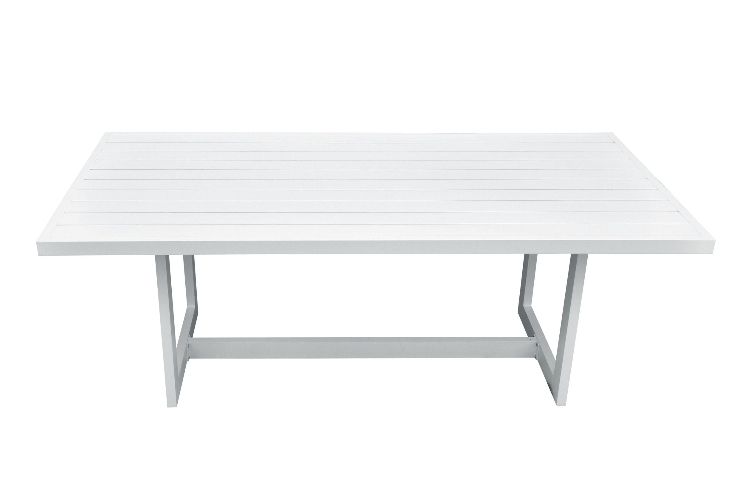 Simple and clean lines give the Renava Wake & Kayak Modern Outdoor DIning Set. The Wake Table is the perfect center piece to complete your outdoor dining set. The white aluminum metal that makes up the structure of this table is lightweight and capable of resisting the weather. The striking color and modern lines make this a perfect set for a modern or contemporary home. The two Kayak Outdoor Armchairs are placed at the ends of the table while the (armless) Kayak Outdoor Chairs bring the total seating arrangement up to 8.