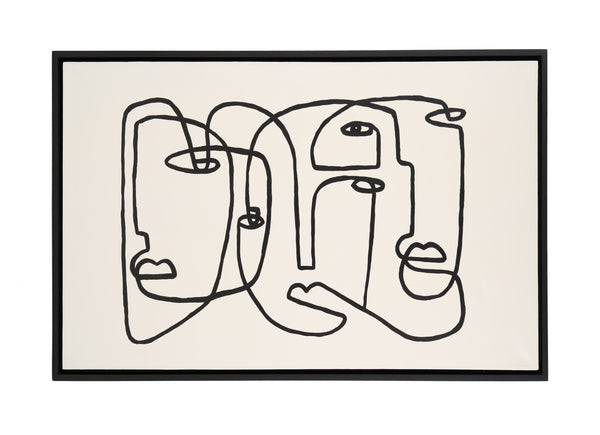 The Modrest Faces modern painting showcases a captivating abstract design featuring interconnected lines and stylized faces in bold black on a soft, neutral background. Encased in a sleek black frame, this artwork adds a contemporary touch to any space, serving as a striking focal point. Its fluid shapes and playful expressions invite curiosity and interpretation, making it an ideal conversation starter for modern interiors.