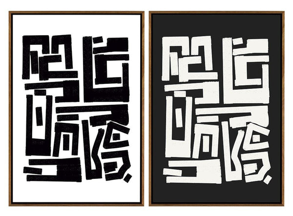 The Modrest Lennox Modern Painting Set features two striking abstract pieces, each framed elegantly in a warm wood tone. One painting presents bold, textured black shapes against a crisp white background, while the other offers a striking contrast with white forms on a deep black canvas. Their geometric designs and monochromatic palette create a sophisticated visual appeal, making them perfect for modern spaces. This set effortlessly enhances interior decor, adding an artistic focal point suitable for any contemporary setting.
