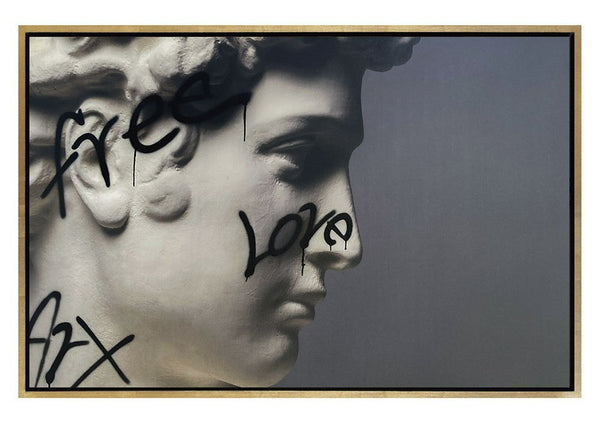 The Modrest Urban Man painting is a striking modern artwork that features a sculptural profile of a classical figure, overlaid with bold graffiti-style text that reads "free" & "love." This intriguing juxtaposition merges traditional and contemporary elements, creating a conversation starter for any space. The piece is elegantly framed, enhancing its aesthetic appeal and making it ideal for modern living areas or artistic interiors. Its captivating design effortlessly draws attention while inviting interpretation, serving as a bold statement piece in your decor.