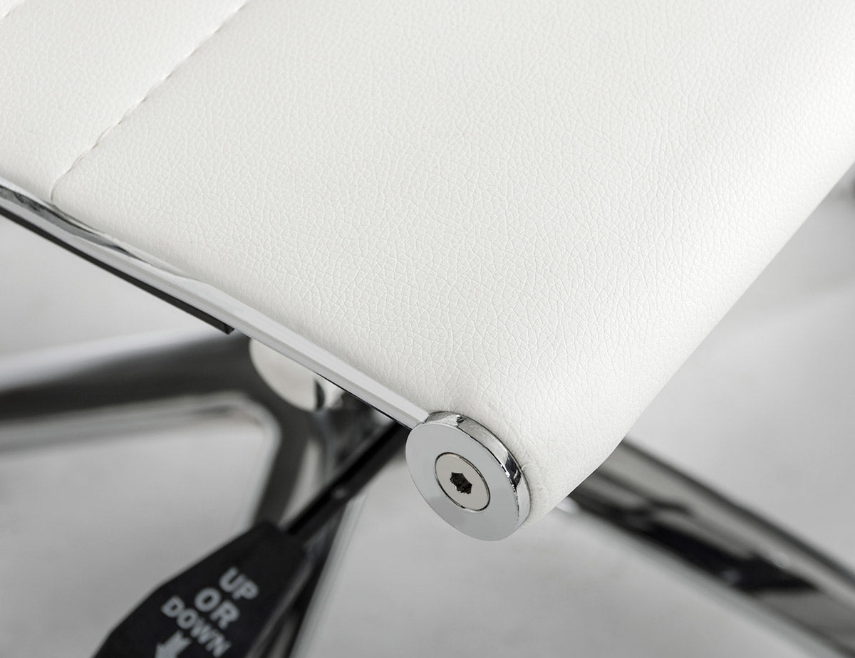 A high backrest provides back and neck support for long days at the office. Upholstered in white eco-leather with small tufts in between the horizontal patterned stitching, achieving the act of beautifying functionality. With the handy pneumatic lift and swivel action, the Scroll Office Chair will make getting work done easier.