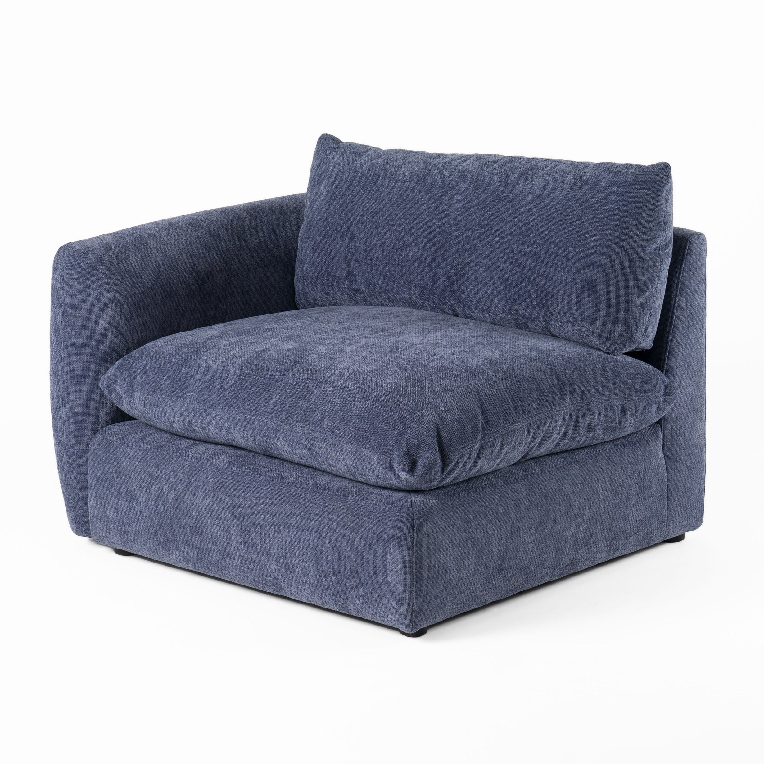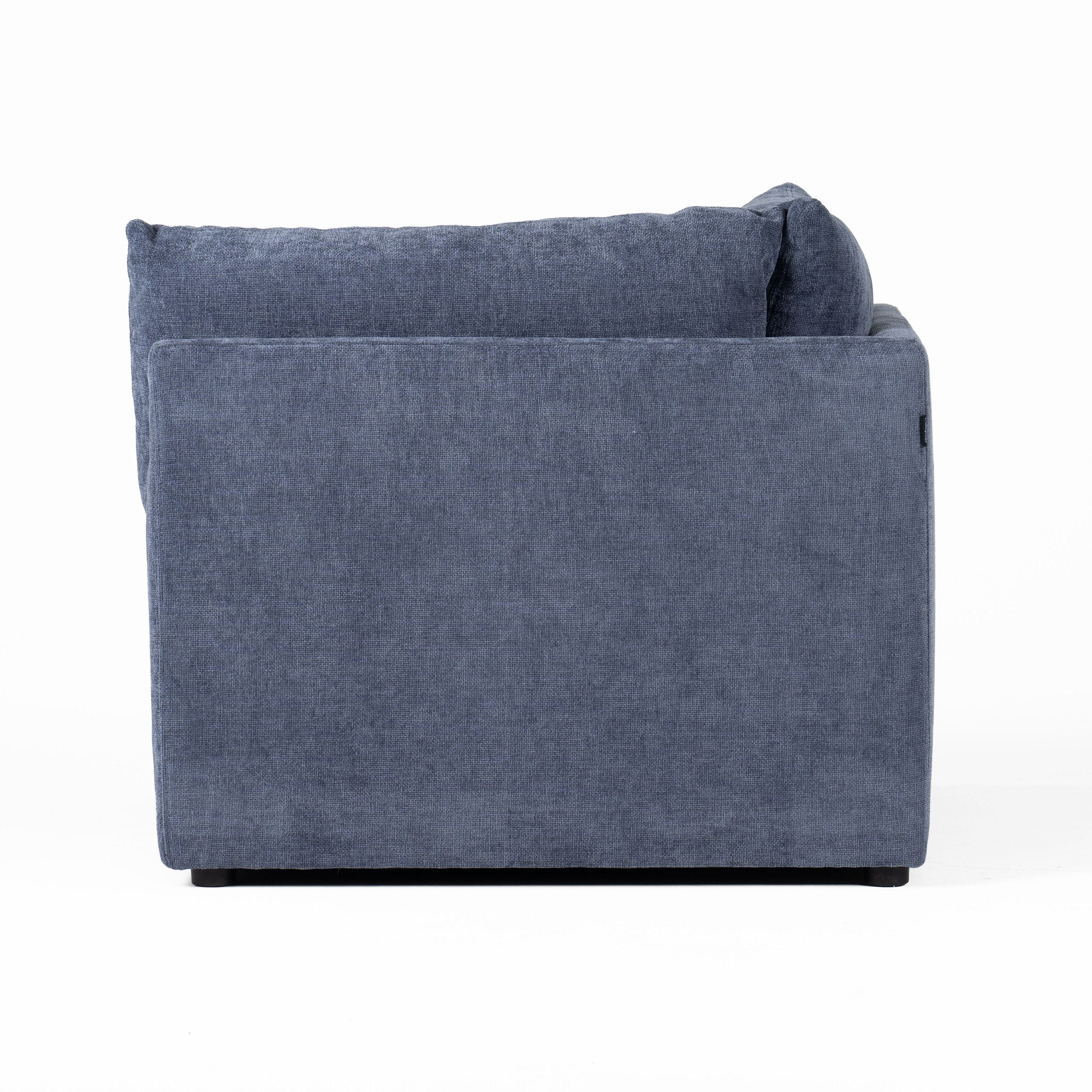The Divani Casa Kinsey - Modern Blue Fabric Modular left facing seat is a stylish addition to any living space. Upholstered in a textured navy blue fabric, it exudes elegance. Its minimalist design features square arms, clean lines, and thick cushions for comfort. Supported by a solid wood frame, this left facing seat is both sturdy and chic.
