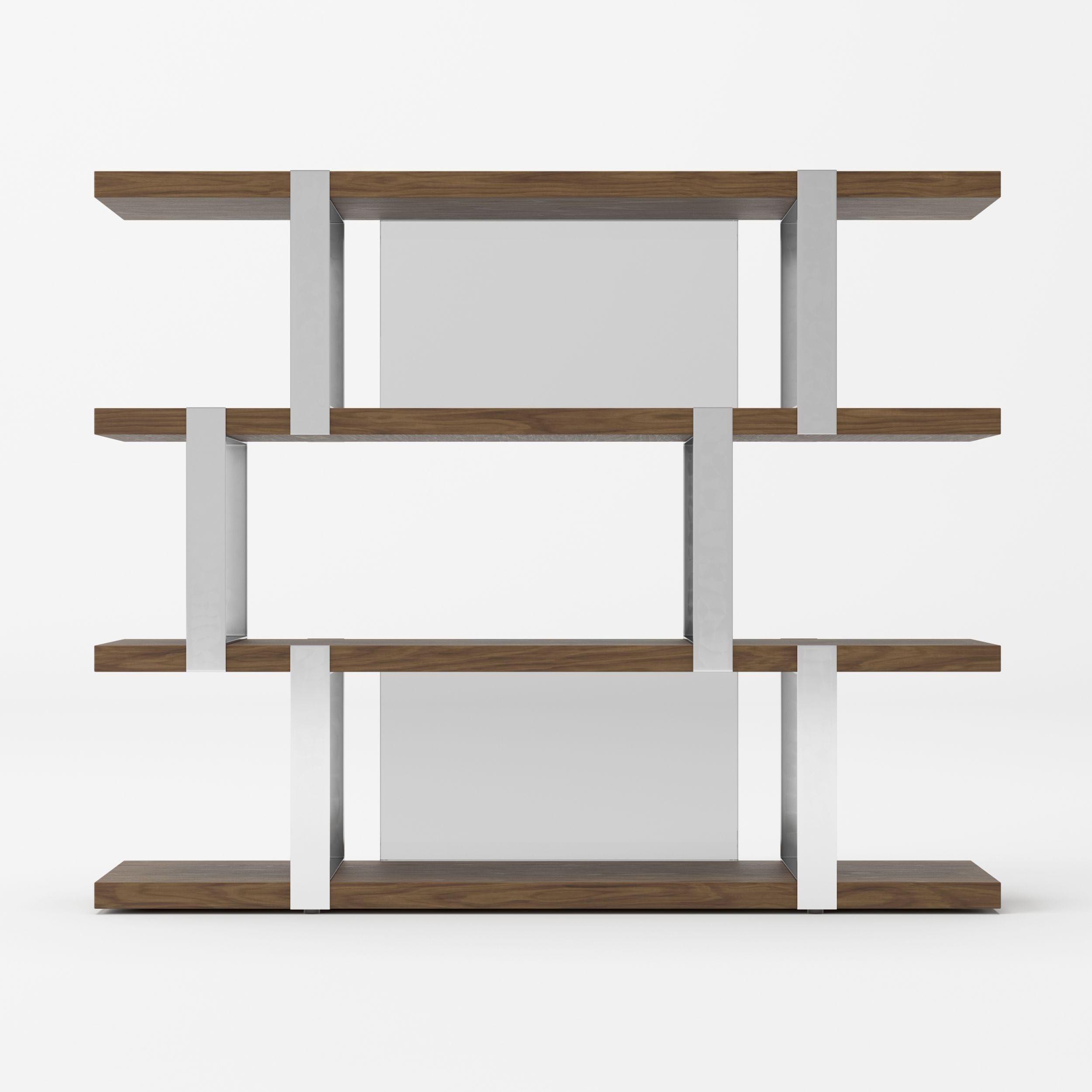 The Brewer bookshelf has four tiers of space for books, picture frames, or any trinkets from your travels. This piece is exquisite with the perfect medley of wood veneer and stainess steel with two glass black panels. The modernism and subtly of this bookshelf will surely lighten up any home office.