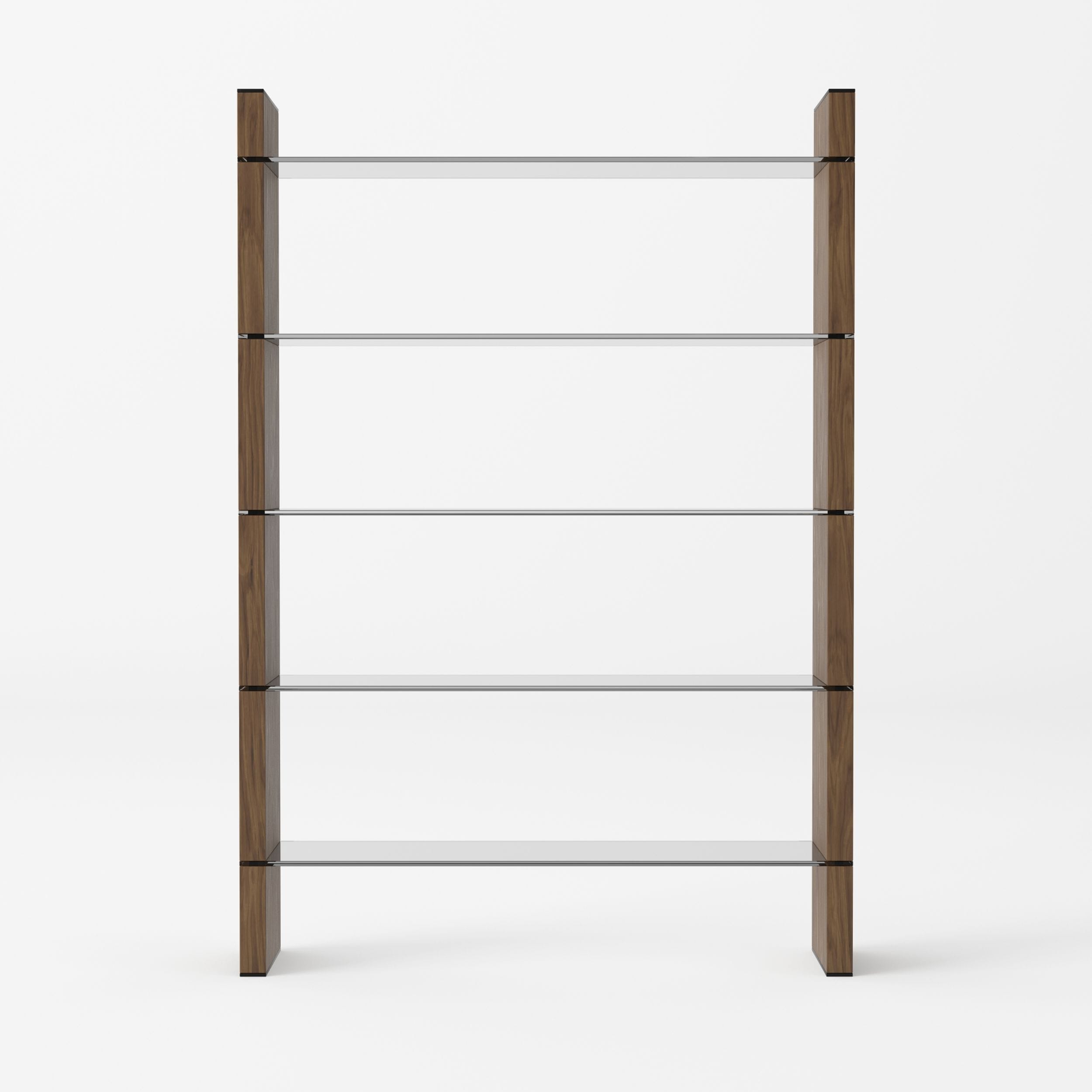The beautiful walnut veneer of the Glencoe Bookshelf is sure to catch an eye in your room. The open back and Black Glass shelves create sleek lines that highlight the modern style of the bookcase. Perfect in any Modern, Contemporary, or Mid-Century Style home.