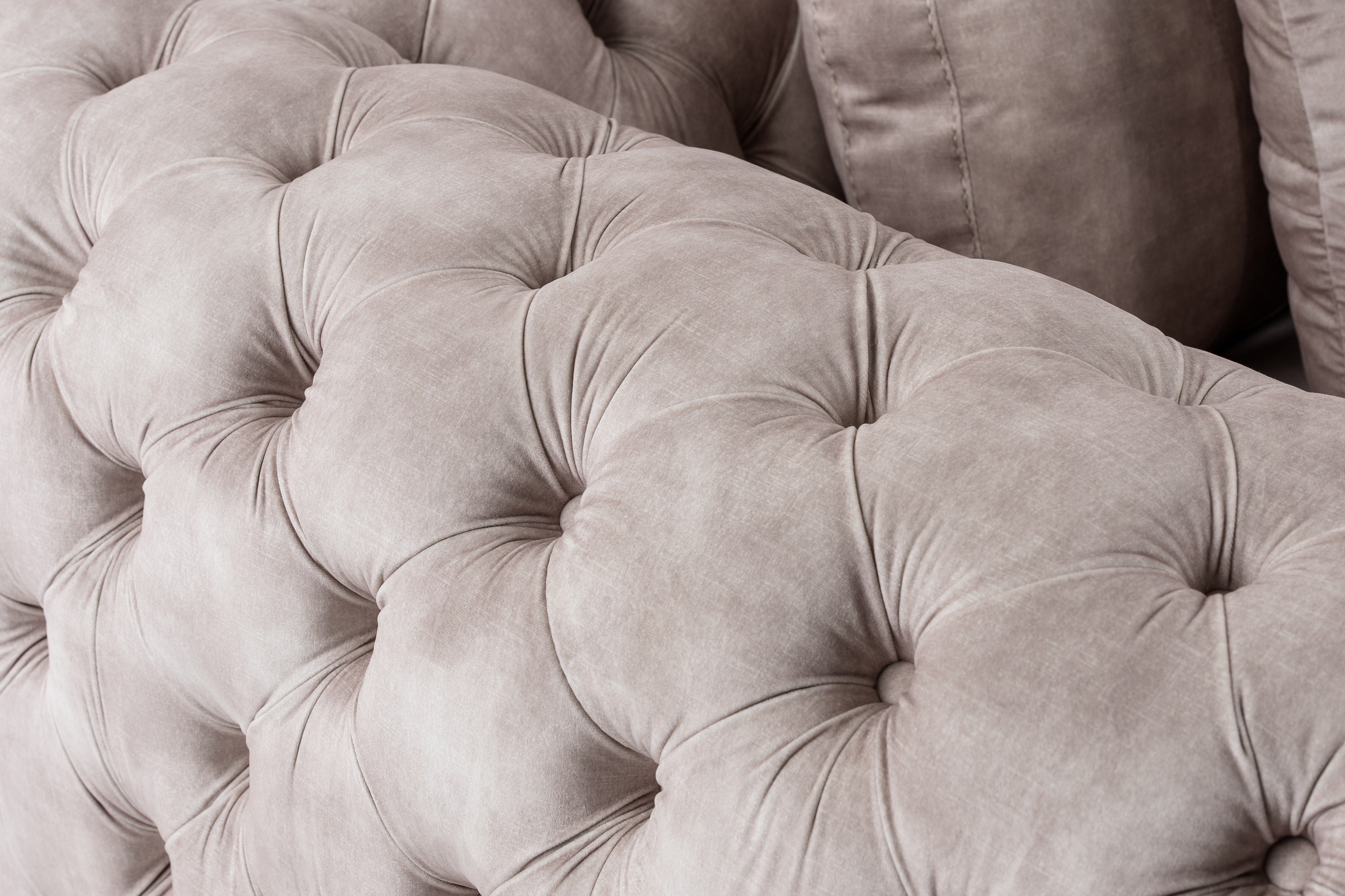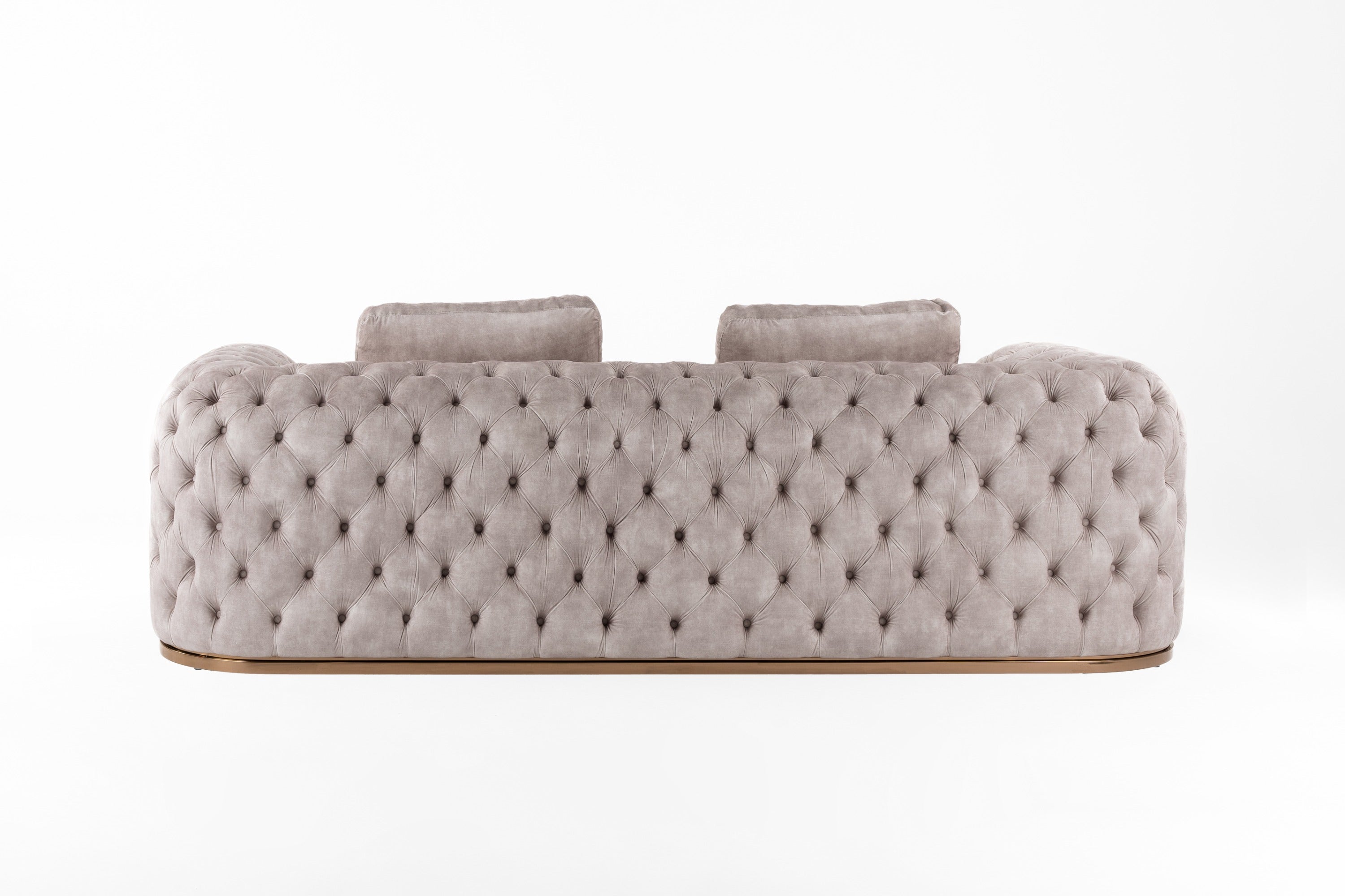 The Divani Casa Dosie Transitional Beige Velvet Sofa is a sophisticated ensemble that combines comfort and elegance. Upholstered in a luxurious beige velvet fabric. The gold stainless steel legs and accents add a touch of opulence, while the button-tufted arms and back provide a classic look. With two throw pillows included, this sofa is perfect for lounging. The eucalyptus wood frame, foam upholstery fill, and sinuous springs seat construction ensure durability and comfort. Whether for entertaining or relaxation, this sofa exudes timeless charm and style.