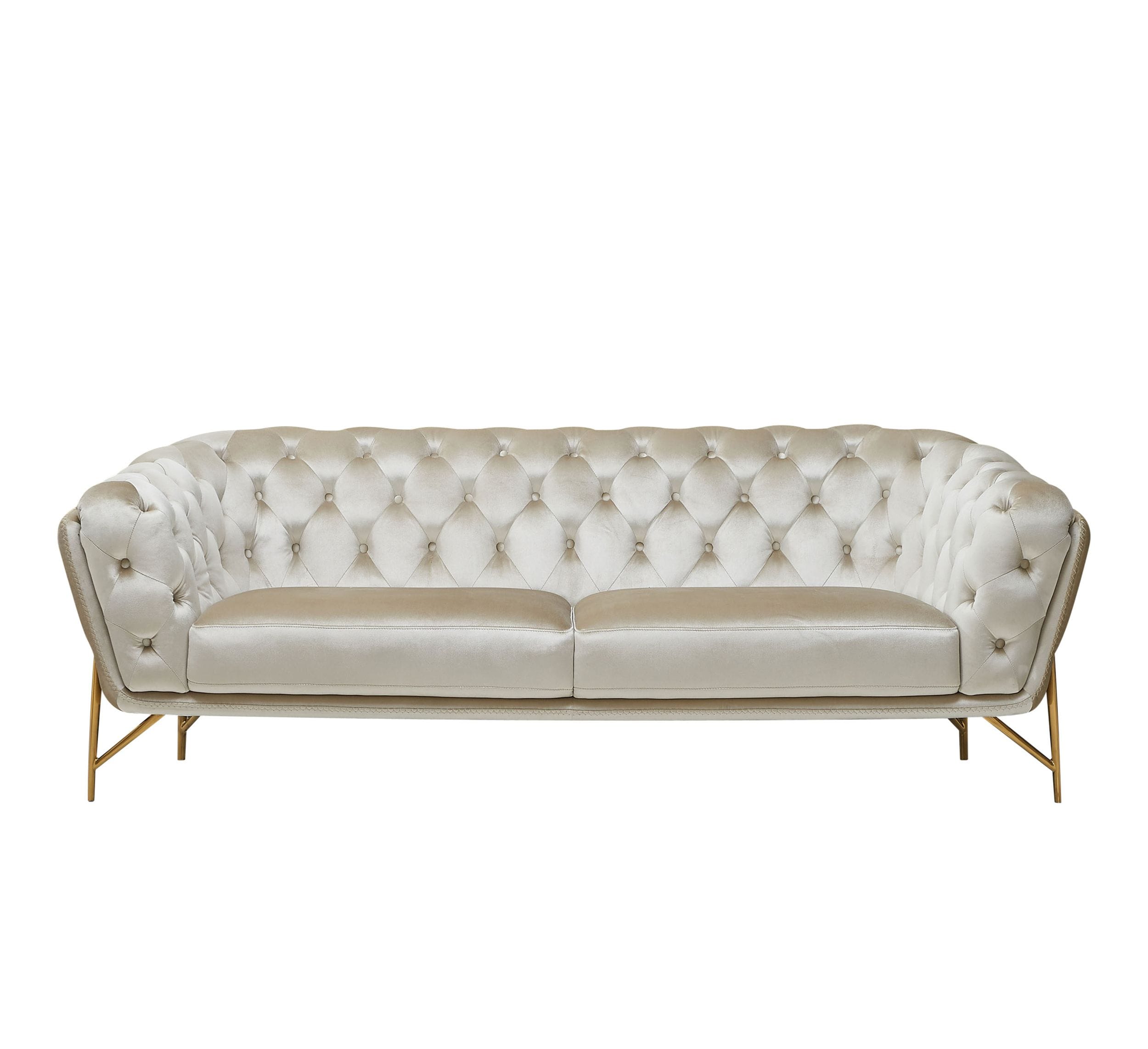 The Stella sofa is a perfect example of glam contemporary style. The soft pearl hue of the velvet upholstery shines in the light and produces an enchanting effect. The back is button diamond tufted to add a luxurious pattern to your piece. A tubular gold frame holds up the exquisite silhouette of this gorgeous sofa. Pair with other Stella pieces for a complete set.
