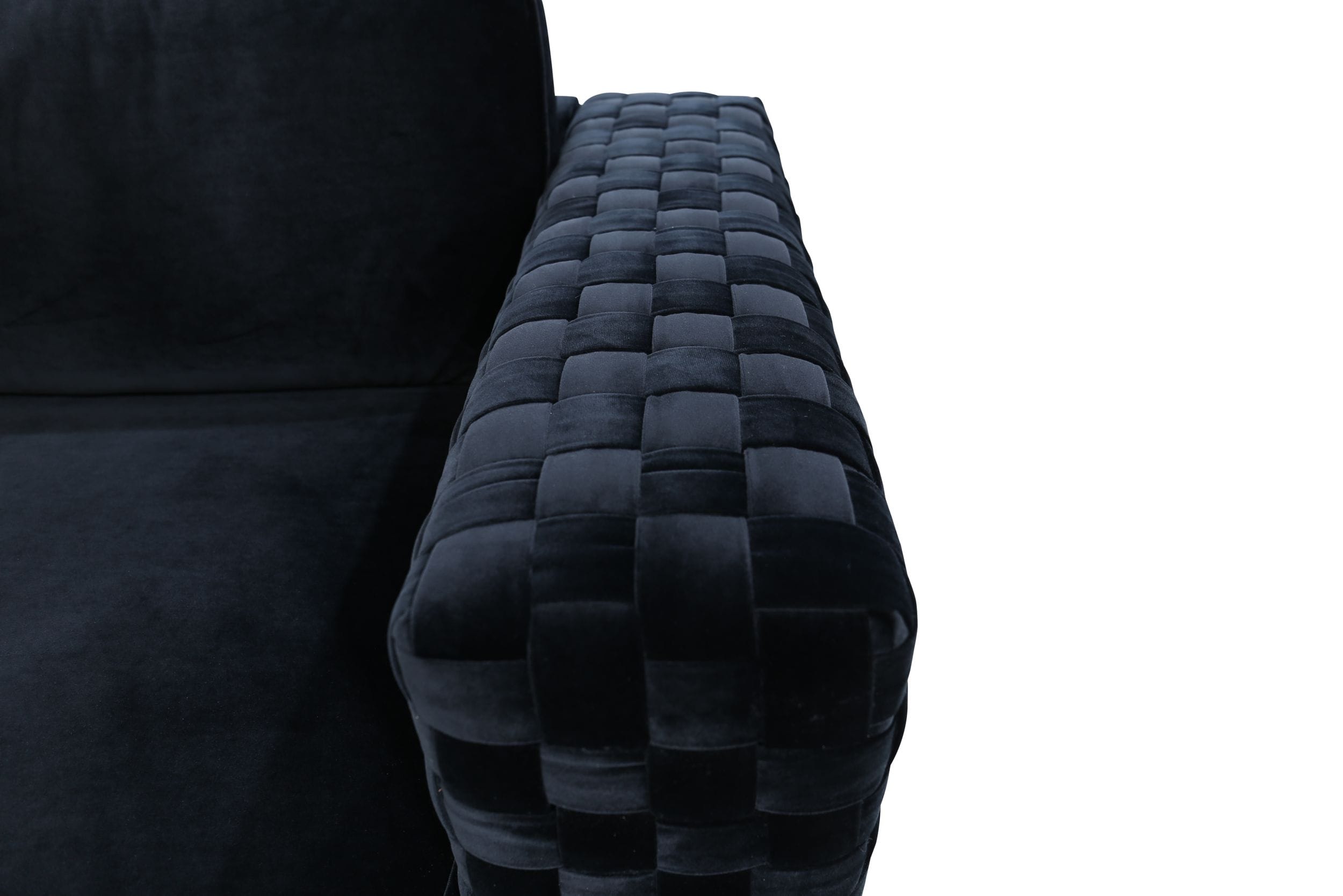 The Lori Velvet Sofa is a gorgeous glam masterpiece. The soft black velvet fully upholsters the sturdy wood frame to create a solid foundation for this stylish piece. The Legs are made of stacked tubular gold that creates an art deco abstract pattern. The stark contrast between the luscious deep black of the velvet against the bright gold legs is astounding.