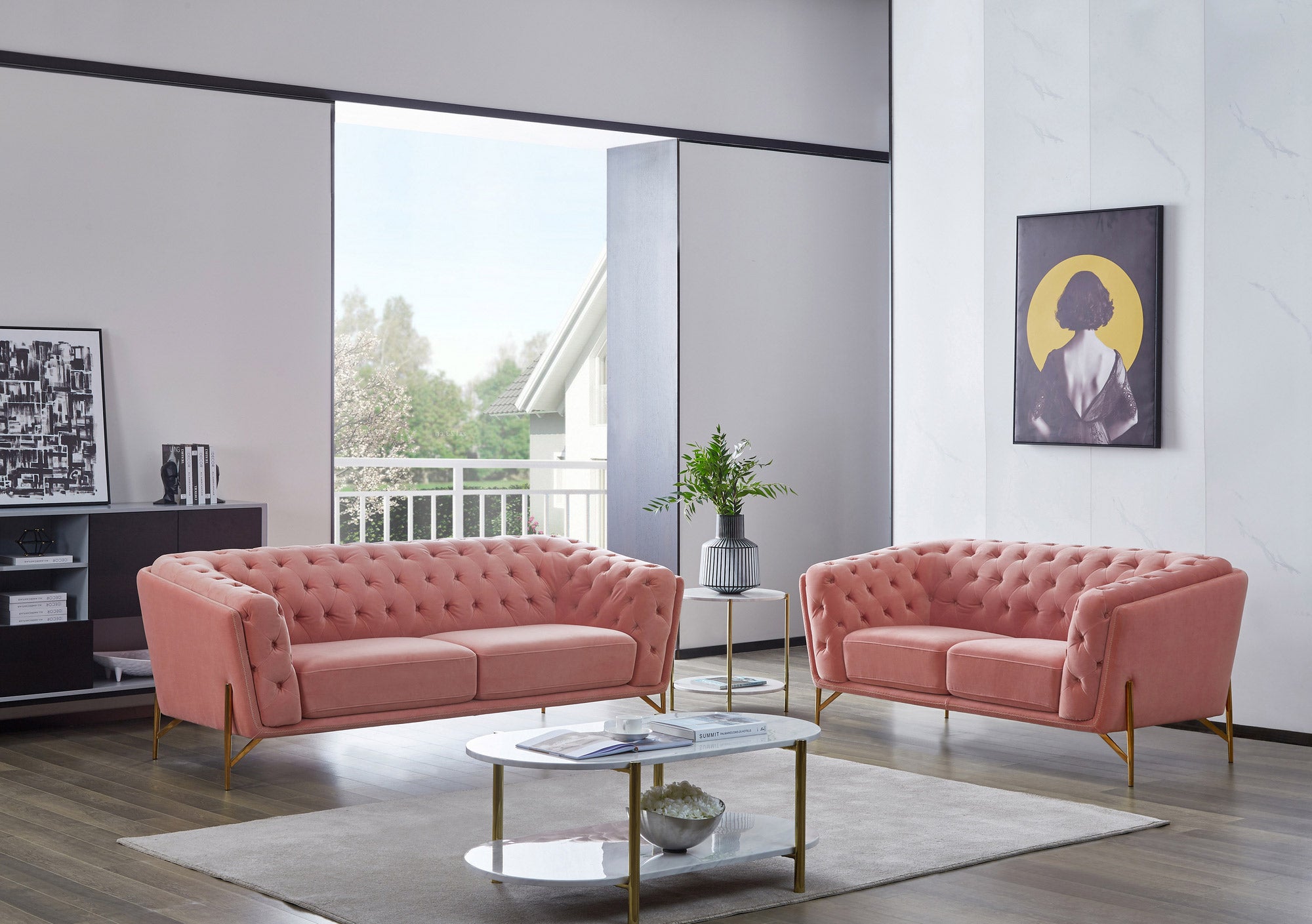 The Aiken Sofa is a lovely contemporary sofa. The glam sofa comes in a salmon pink velvet and the back is diamond tufted. The gold hairpin legs add another touch of luxury. The double-layered back and arms have a lovely cream-colored exposed stitch that adds a bit of rockstar to this delicate sofa.