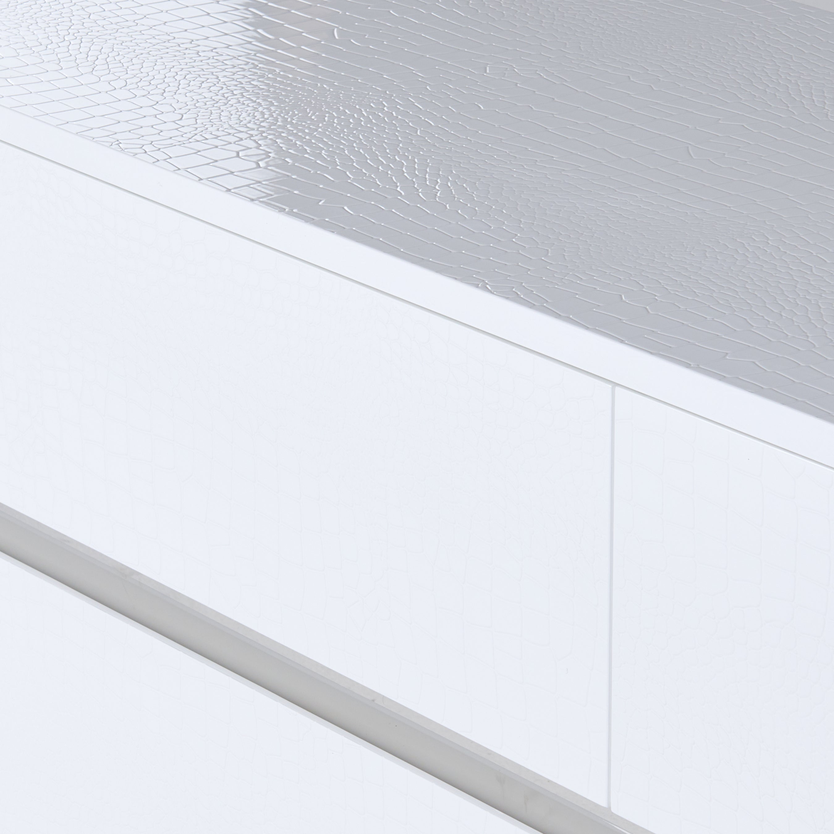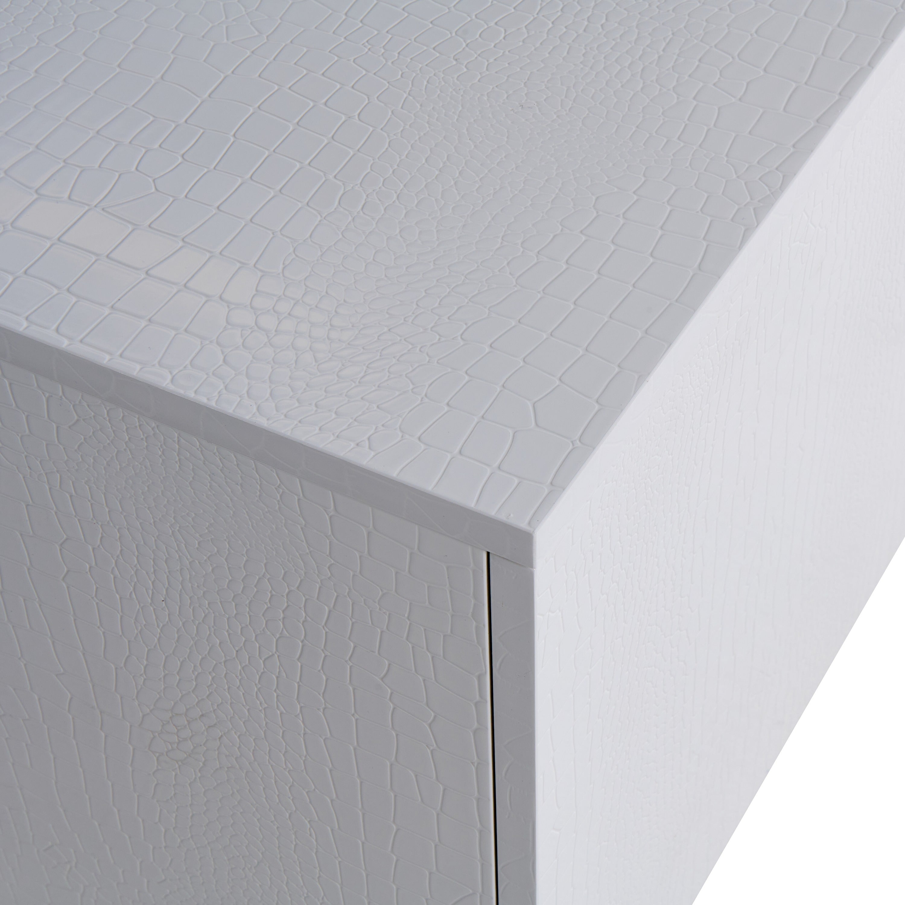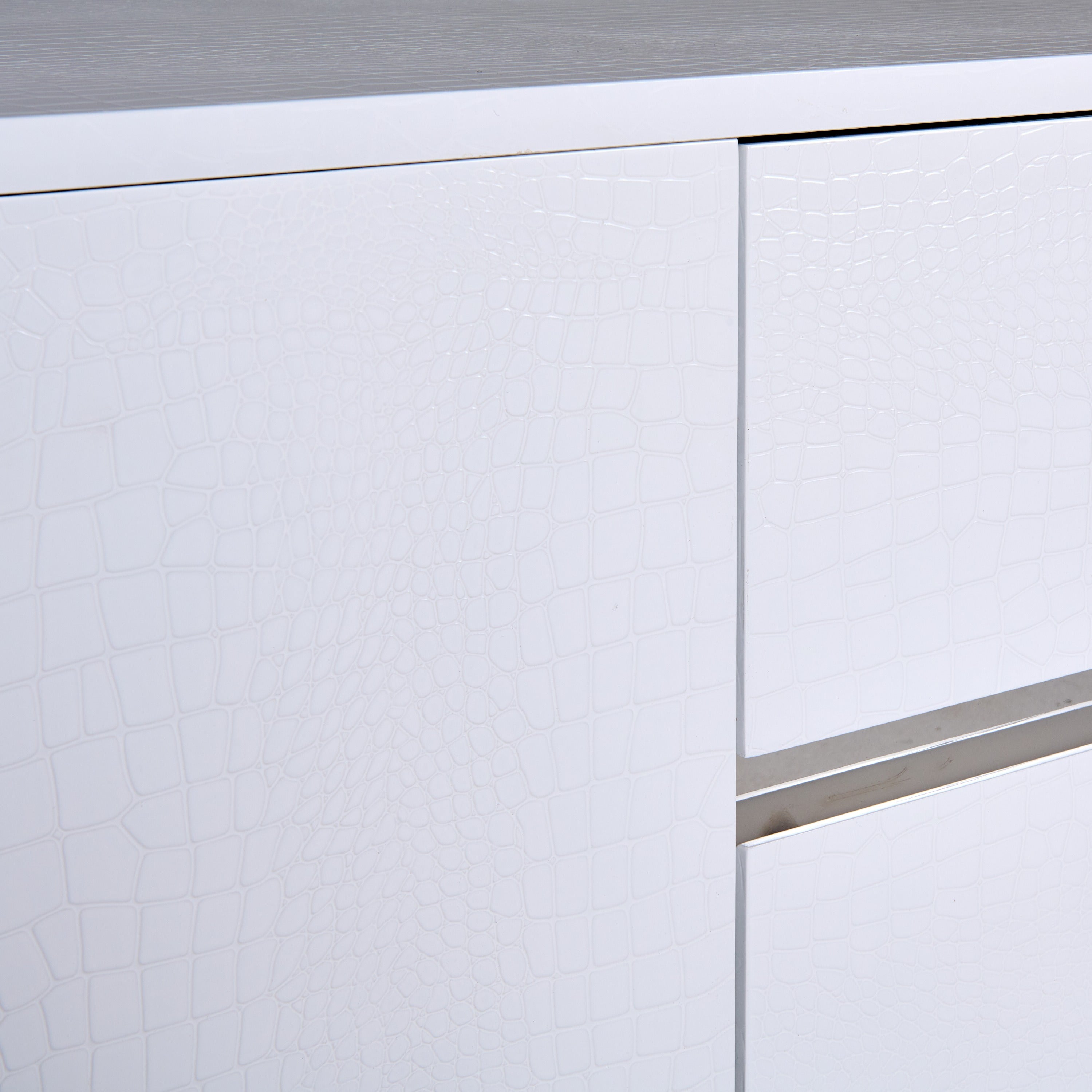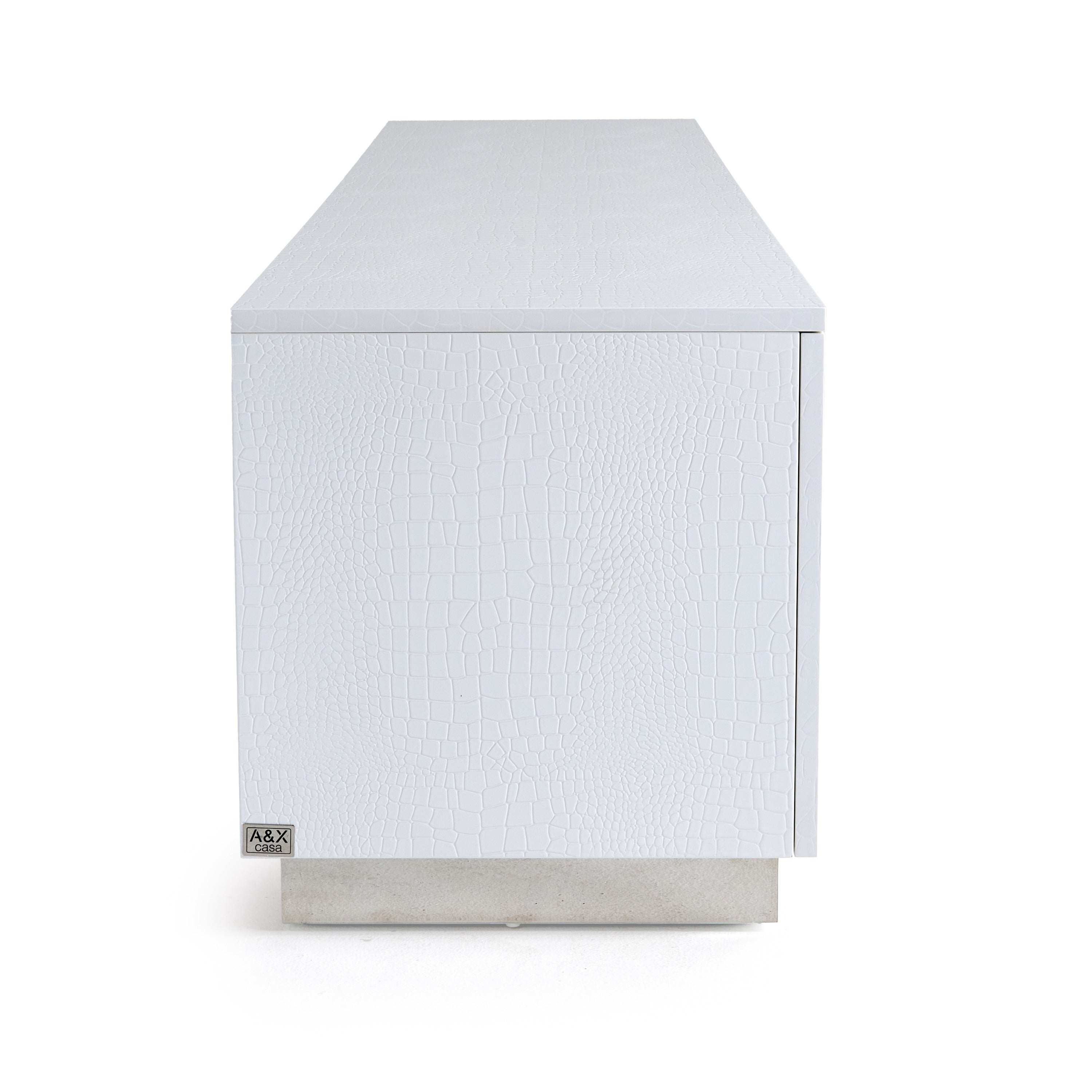 A durable white lacquered semi gloss topcoat covers the signature A&X laser-cut crocodile textured surface. Stainless steel finished strips and glides accent the buffet. Four self closing drawers with ball bearing sides make the buffet easier to use while the two side doors provide additional storage for your entertainment needs. Included in the A&X Casa Luxury Collection and available in black and white. Matching set pieces available separately.